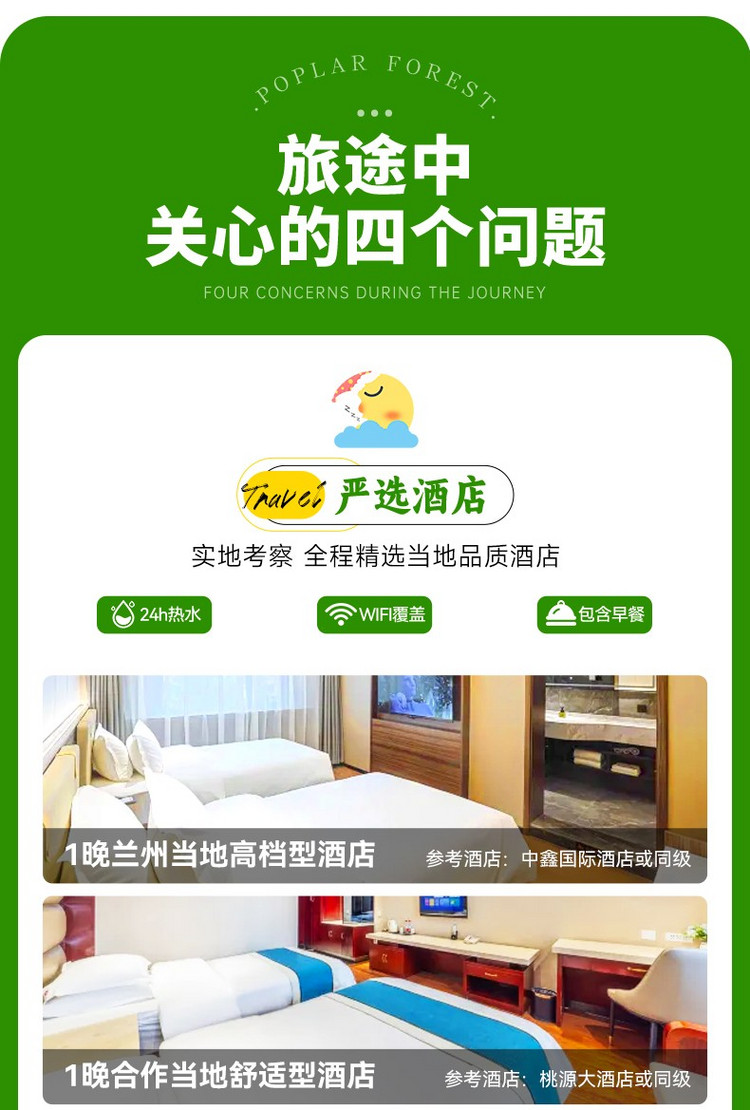1、交通:兰州出发及兰州解散的全程专属用车及司机星级服务(含司机餐补、住宿)