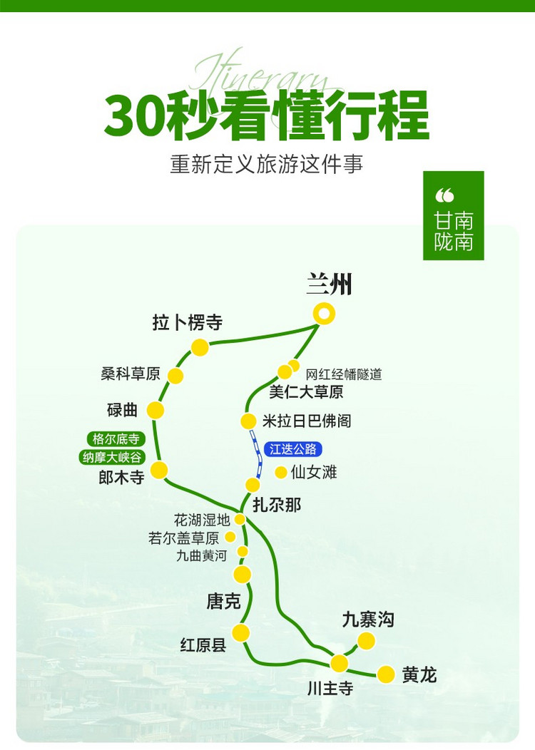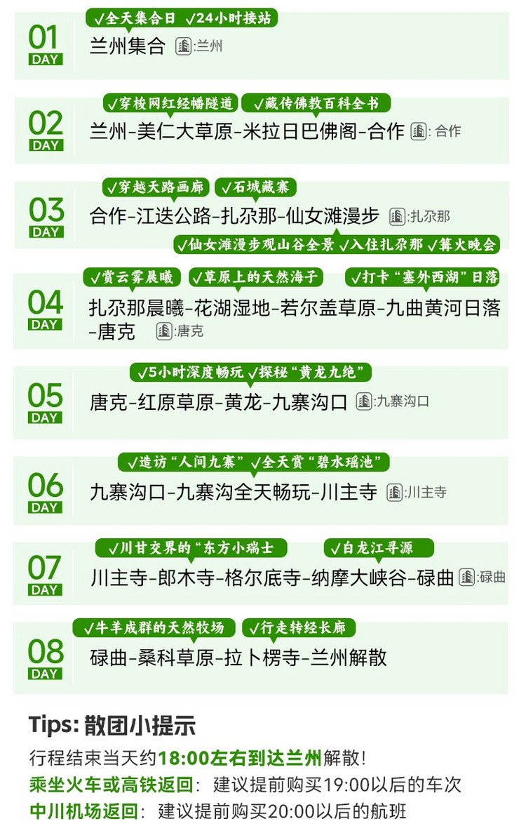 2、行程结束当天18:00左右抵达兰州西站,大家可以依据自己的时间,自行选择继续游玩或是启程回家。火车/高铁建议购买19:00以后的车次,飞机建议购买20:00以后的航班。兰州火车站距离兰州中川机场约68公里,车程约1.5小时。兰州站距离机场大巴客运中心站徒步300米,到达机场71公里,用时1小时25分钟左右,大家根据自己的航班车次选择返程票。
