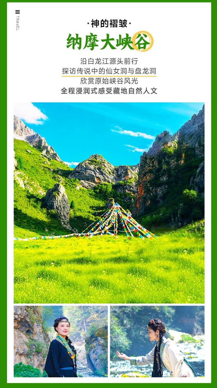 接着我们沿着白龙江的源头,徒步进入【纳摩大峡谷】(徒步约2小时),徒步强度不大,老少皆宜。峡谷两边峭壁高耸,道路狭窄,之后就有步入桃花源的感觉,复行数十步,则豁然开朗。我们在怪石、清泉、峭壁与草甸的交织中,感受这片宁静的净土。