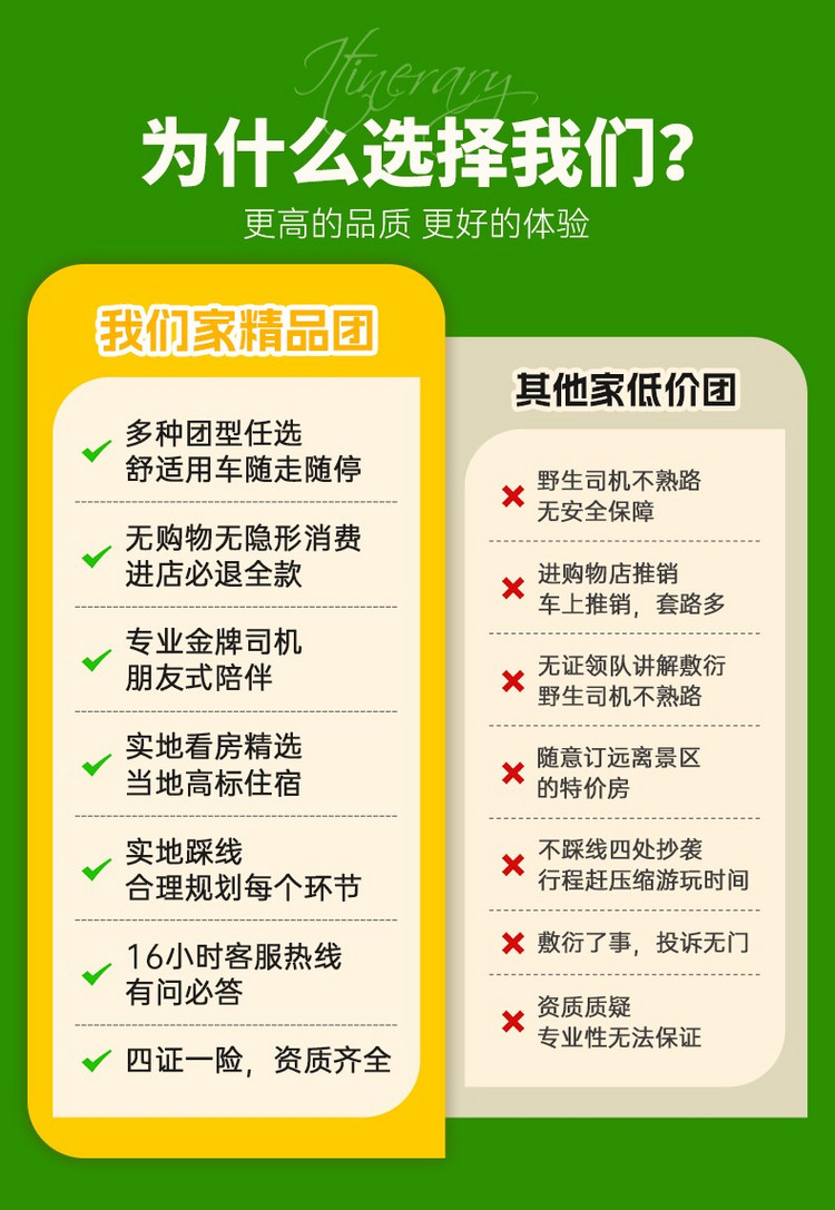 11、出游过程中,如产生退费情况,以退费项目旅行社折扣价为依据,均不以挂牌价为准。