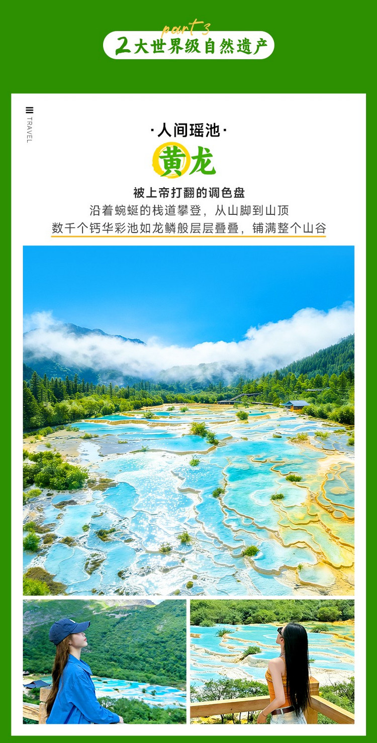 黄龙海拨较高,大家可根据自己的体力量力而行,值得一提的是黄龙寺旁的五彩池,无数个大大小小的池子像是装满五彩颜料的调色盘,在阳光下光彩夺目,摄人心魄。沿途还可欣赏迎宾池、飞瀑流辉、洗身洞、盆景池、黄龙寺等。