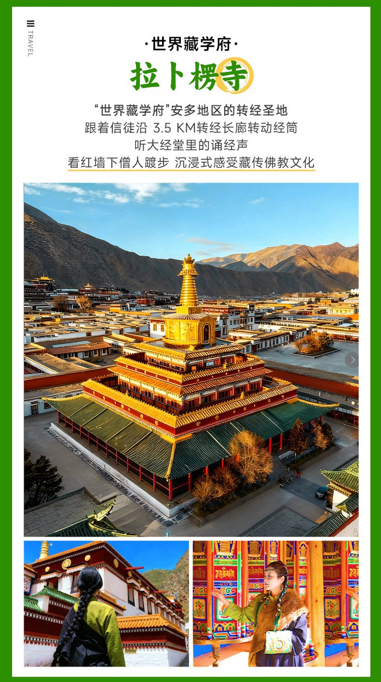随后前往藏传佛教格鲁派的六大寺之一的【拉卜楞寺】(车程约30公里,用时0.5小时,游玩约2小时),这里保留有全国ZUI好的藏传佛,被世界誉为【世界藏学府】。