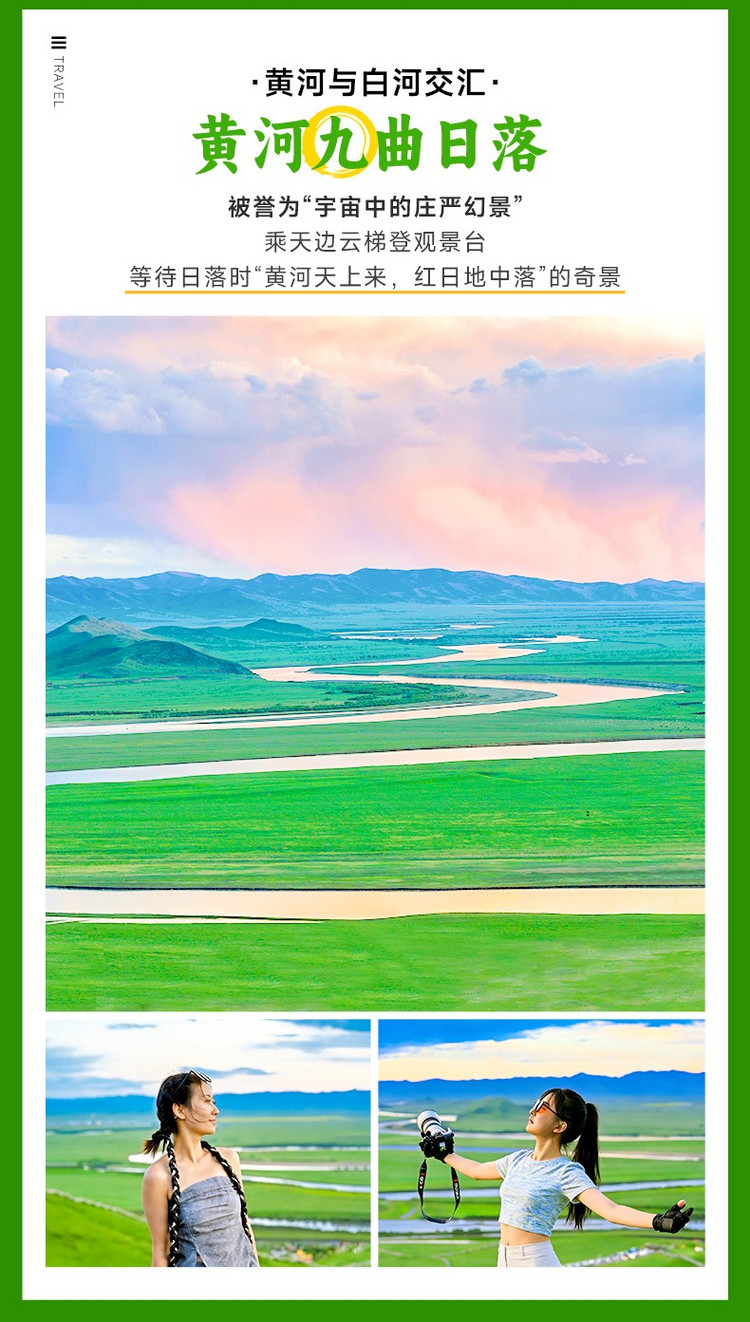 下午,前往【九曲黄河第一湾】(车程约100KM,车程约2小时,游玩约2-3小时),这里是黄河唯一流经四川的段落,形成"S型"绝美弯道。乘扶梯上山顶,看夕阳将九道弯染成金色,被誉为"宇宙中ZUI浪漫的曲线"。在黄河栈道:近距离拍摄水流与草原,也可以前往红教寺庙,可俯瞰黄河全景!