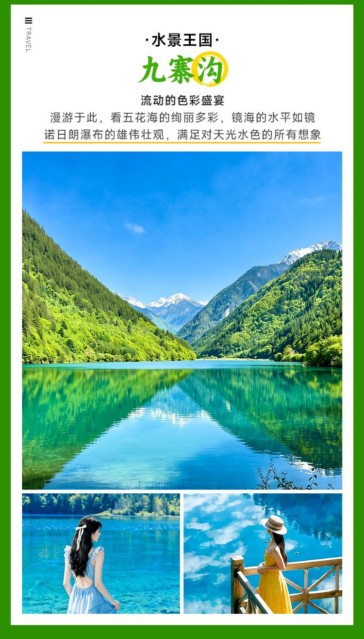 九寨沟的风景四季都十分迷人各有特色,春时嫩芽点绿,瀑流轻快;夏来绿荫围湖,莺飞燕舞;秋至红叶铺山,彩林满目;冬来雪裹山峦,冰瀑如玉。