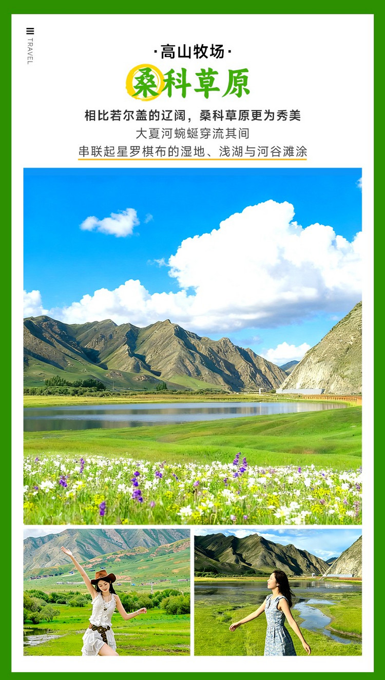 早餐后,我们驱车前往水草丰美的【桑科草原】(车程约90公里,用时1.5小时,游玩约1小时),每当夏季,绿草如地毯般在草原上铺开,其间点缀各色花卉,牛羊悠然,夏河蜿蜒,我们可以自行骑马、漫步,感受草原纯粹的宁静与自由。