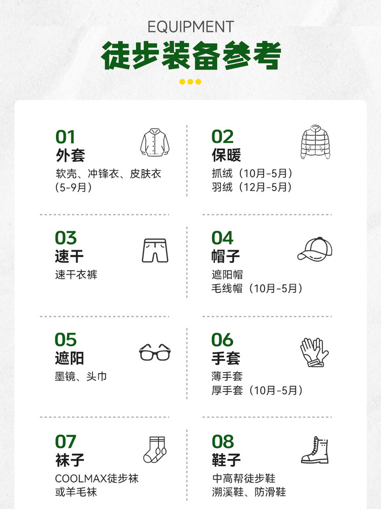 1)衣裤:穿着基本以春秋装为主,建议速干衣裤/防晒衣,带一件单层冲锋衣备用。(任何季节都切勿穿短袖短裤),山林昼夜温差大,需带至少一件厚外套早晚御寒。