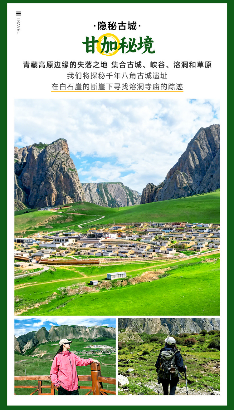 早餐结束我们乘车前往甘加秘境(车程约40分钟,36公里)。我们乘坐景交车前往白石崖,路途中会经过【八角古城】城墙呈八角形,加上马面有二十角,外部所有地方都在城墙上弓箭手的射程之内且全无死角,在本地藏民心中,其造型与防御 “魔众入侵” 的圣地 “坛城” 一致,大家可以下车参观打卡。