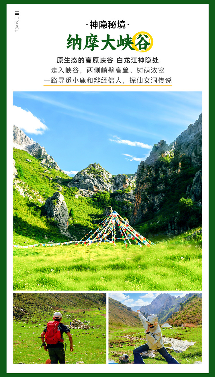 我们从达仓纳摩格尔登寺售票处进入,正式开始今天纳摩大峡谷徒步旅程,沿着小路前行,很快就能看到白龙江边的仙女洞,洞内有一尊婀娜如人形的钟乳石。从仙女洞出来,在洞口的悬崖上可以看到老虎洞,老虎洞俯视着泉眼,居高临下,虎踞雄威。跨过源头再向里走,峭壁悬岩,危峰兀立,还有飞鹰崖、鸽子洞等景观。继续往峡谷里走,蹚过溪流,会碰到一些牵马的当地人,再往前走不到 1 公里,就能到达天然牧场。从天然牧场继续向前走,我们会看到峡谷内巉岩峭壁林立的 “一线天” 景观,又有广袤的山谷草坪,还有清澈的溪流潺潺相伴,景色变化丰富。徒步中路线几乎保持着原生态,没有过多的人工雕琢痕迹,徒步的路迹清晰但较为原始,可以让我们充分感受到大自然的宁静和神秘~