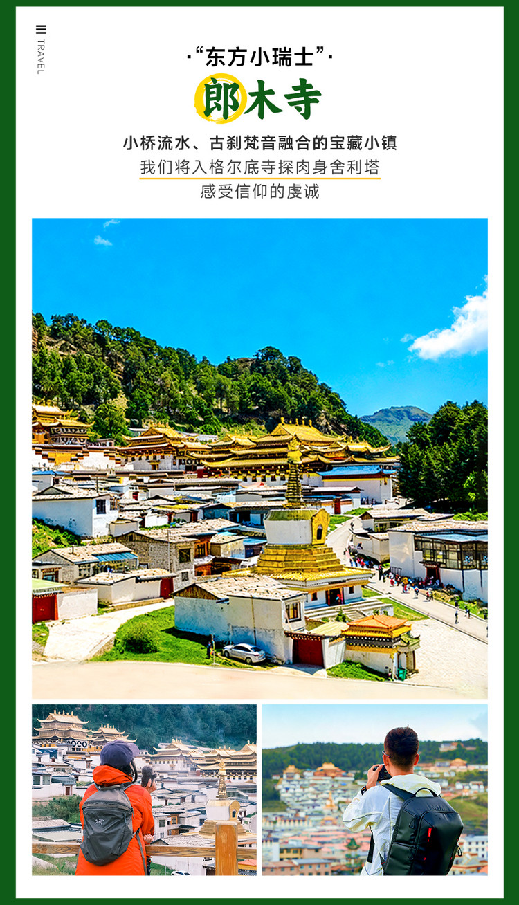 而徒步的尾声,会在仙女滩邂逅极致的人文与自然交融之景。站在开阔的林间草甸上,360 度全景将扎尕那四村一寺尽收眼底,东哇村的藏式木屋依山而建,炊烟袅袅;拉桑寺的金顶在阳光下熠熠生辉,梵音隐约可闻,高原村落的质朴与宗教圣地的庄严在此完美融合,为整段徒步画上圆满且震撼的句点。