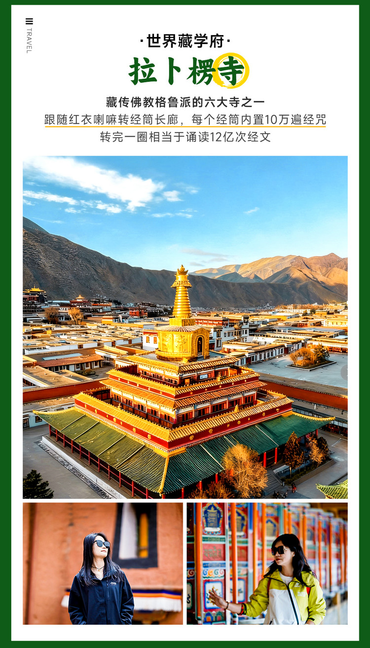 我们今日活动量较小,主要是适应高海拔,行程是轻徒步绕寺一圈(3.5公里),拉卜楞寺的转经长廊是全世界最长的,环绕寺院东西南三面,有 2000 多个转经筒,伙伴们可以一边步行游览,一边转动手边的转经筒,为亲友祈福。转寺祈福结束后大家可自由进入散布在建筑群中的大殿参观,重点游览闻思学院、弥勒佛殿、酥油花殿等。闻思学院是寺院的中枢,有机会的话可在此看到千人诵经的场面;弥勒佛殿是寺院最高的殿,顶部鎏金铜瓦格外显眼;酥油花殿是室内唯一可以拍摄的殿,酥油花、唐卡和壁画被称为藏传佛教的艺术三绝。
