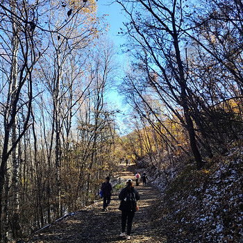 今年的温度降的比较早,往年要十一月份才会这么冷。喇叭沟门的最美季节也提前了。这个时候来有点晚了,好多叶子都掉了,但是有一种不一样的萧瑟的感觉,也是新的体验。更妙的是前一天晚上还下雪了,上到观景台以后看到了雪景,额外的收获。