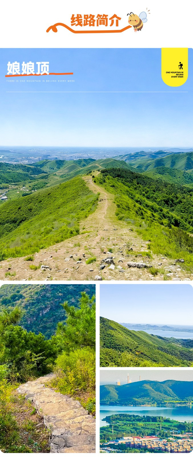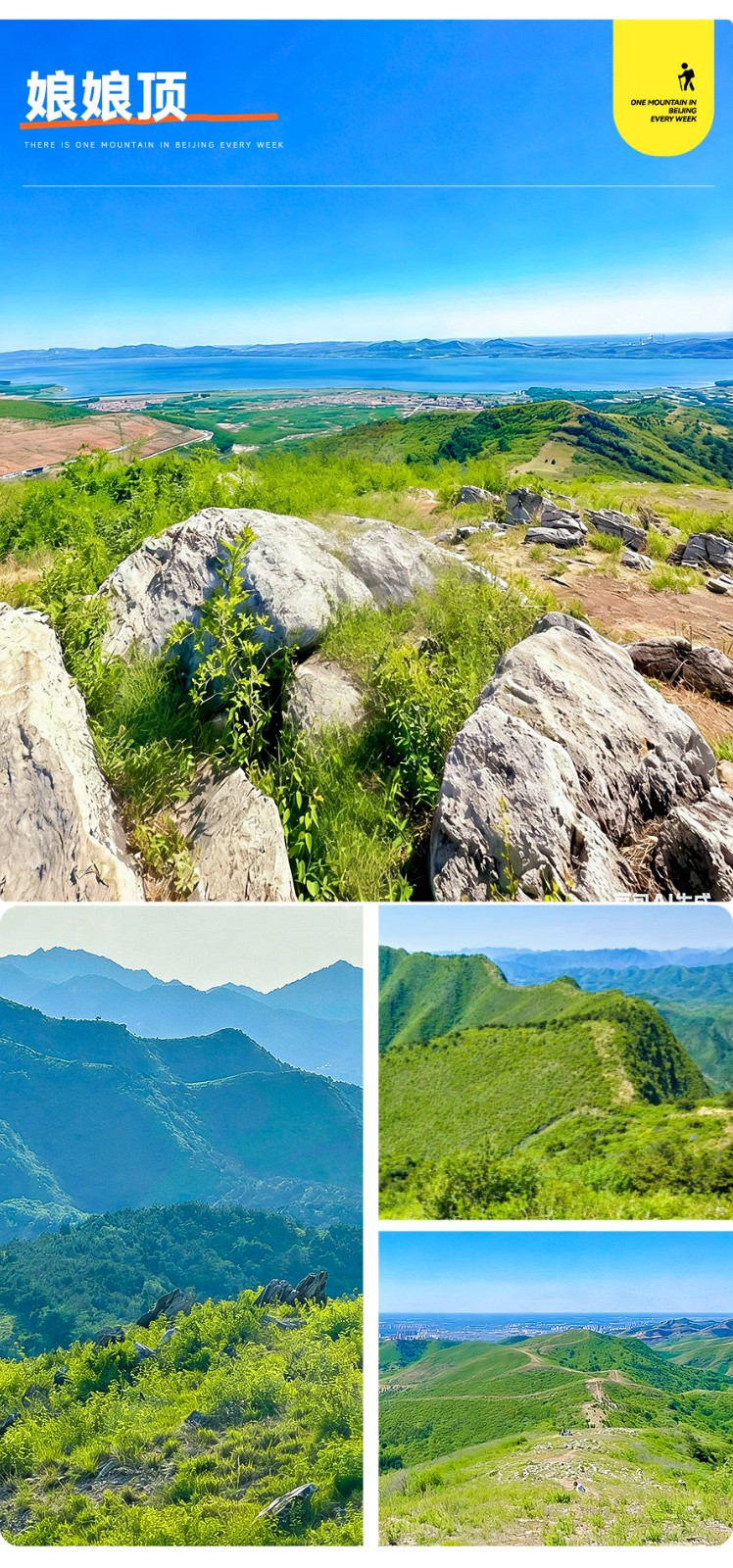 娘娘顶坐落在天津市蓟州区穿芳峪镇的西南侧,海拔560多米,是当地群山之中的最高点,在登顶的途中将体验到不同的路况和景色,集合了松树林、森林小路、金色山脊路和水库美景。行走在娘娘顶的山脊路上,向西可望府君山五华峰以及盘山,向北可见延绵不绝的山峰山脊,向南可见波光粼粼的于桥水库,是一日山水徒步的绝佳路线。