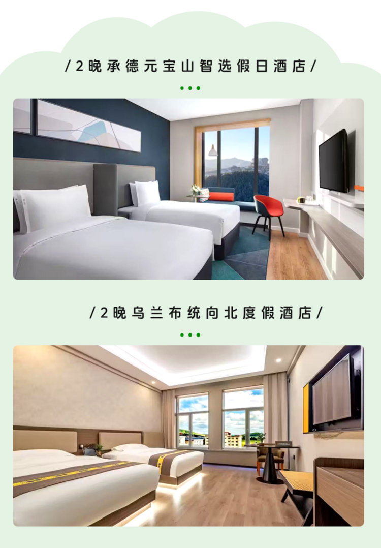 承德精选当地4钻酒店,健身房泳池等设施一应俱全;客房宽敞舒适,乌兰布统2晚精选酒店连住,免去搬行李的烦恼,超省心~
