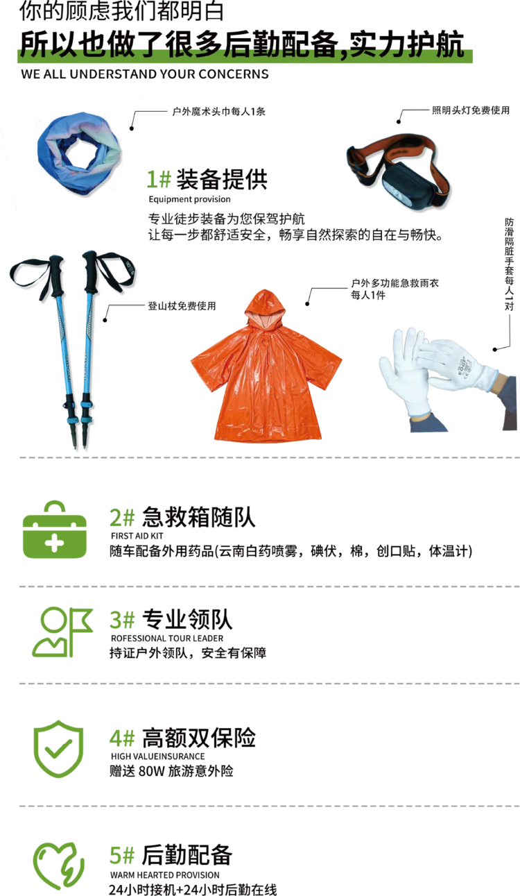 3.活动提供装备中说明的:头灯/登山杖各一件免费租借(用后回收,如需要双杖请提前告知),赠送一次性雨衣/头巾/手套(不回收)