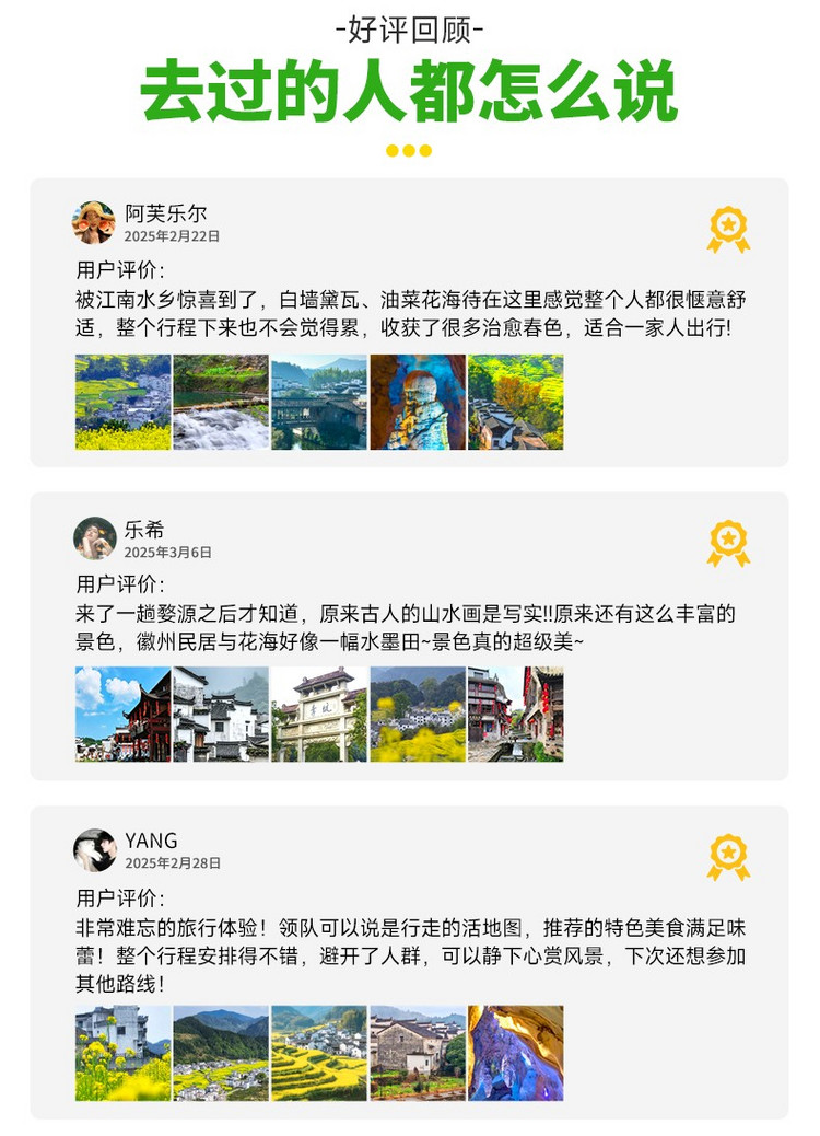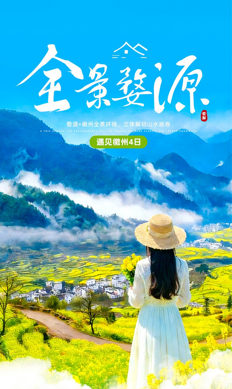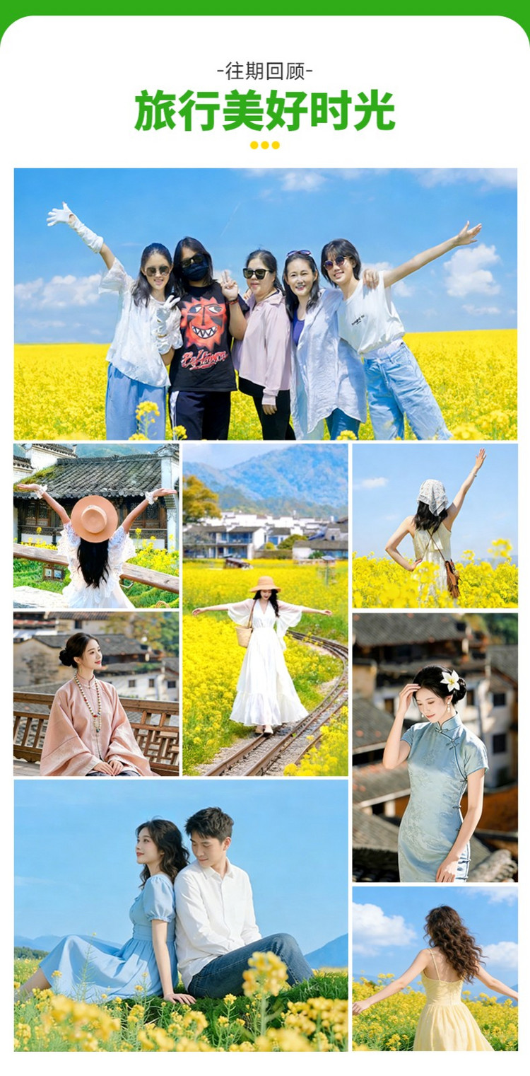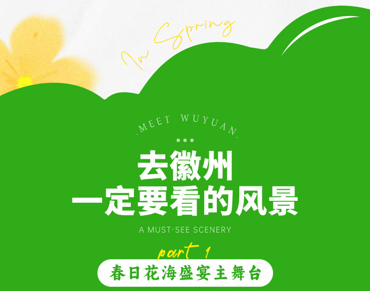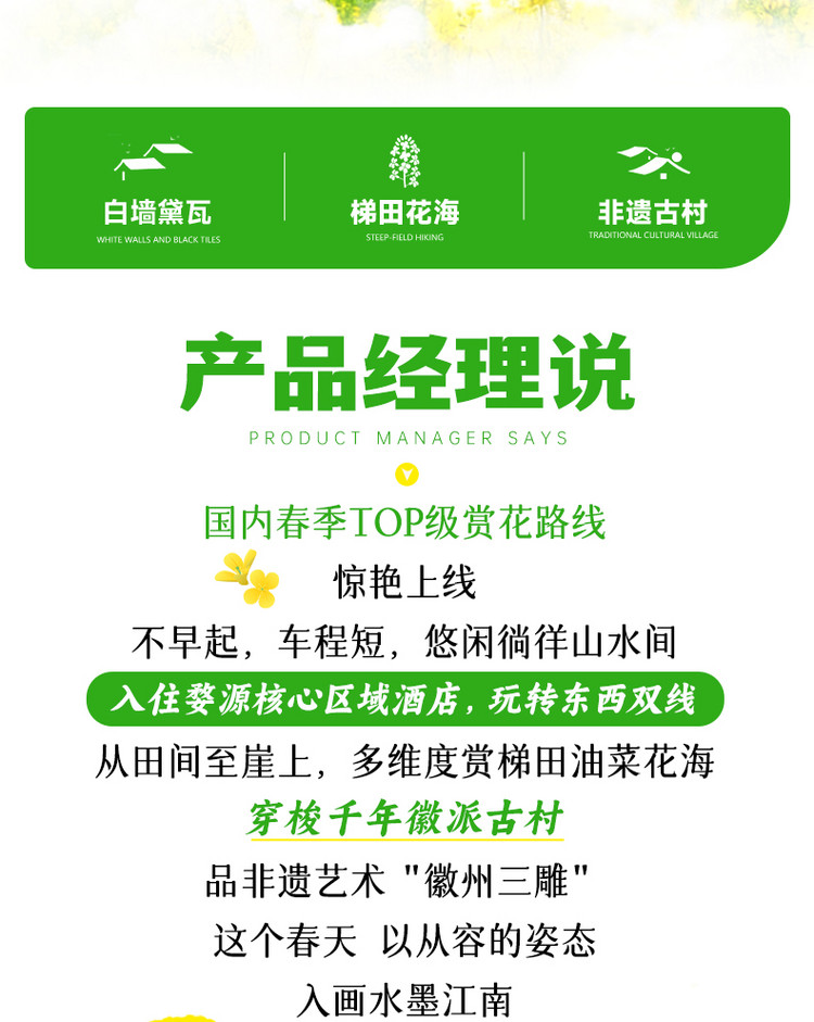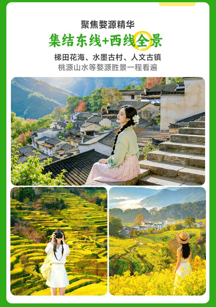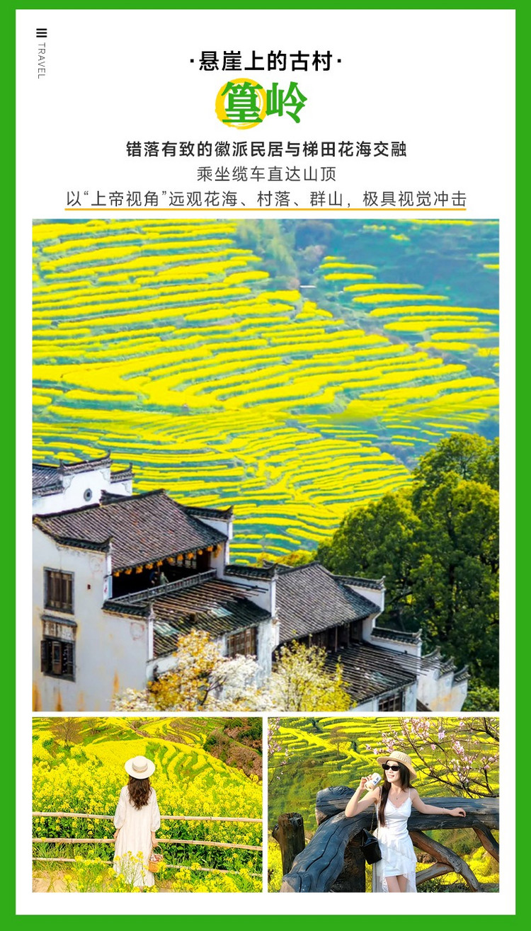 ·【江岭】这里是中国四大油菜花海之一 、10万亩梯田油菜花海、 被赞誉为天上人间。堪称婺源油菜的代表之作世界级摄影基地,婺源春季旅游赏花首选风景点,婺源田园风光的经典代表!这里可以看到最壮观的山中田园风光,我们能看到山坡上黄绿相间的梯田,典雅的徽式建筑坐落其间,实在是婺源油菜花最经典的拍摄地之一。古树、河流、梯田、农舍、农作物合理布局,体现了人与自然的亲近、和谐,“天人合一”在这里得以展示。尤其是山顶人家成了江岭风光的大背景,远眺白墙黛瓦掩在黄花绿树间,阵阵云雾飘来,恍若天上人间。
