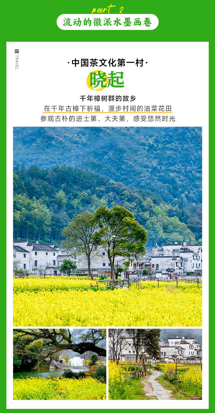 ·【晓起】中国茶文化第一村,村口大片千年古樟群,是晓起标志性景观,在这我们能看到高大的牌坊、水车、祠堂等,保存 600 余年的明清古宅,如进士第、大夫第等,木雕精美,能够充分的感受徽州文化。中午可以在晓起午餐,这里饭店较多可自由选择。