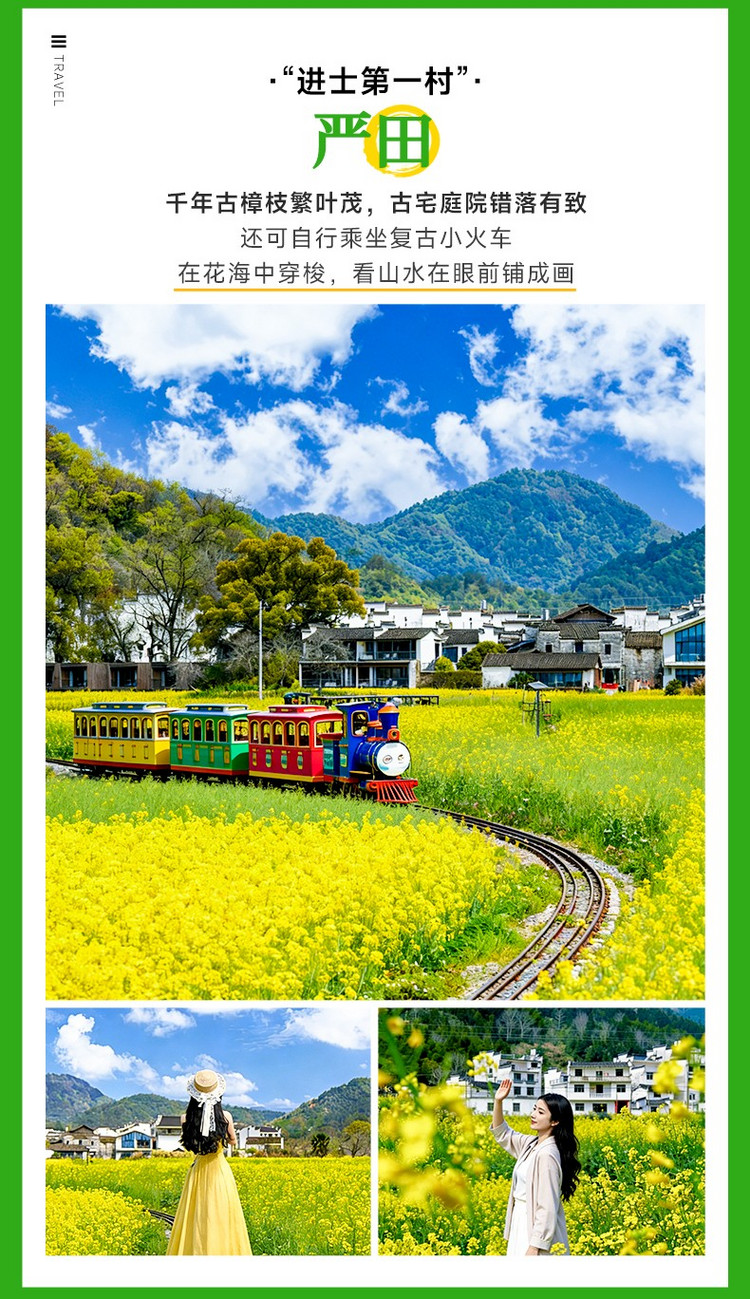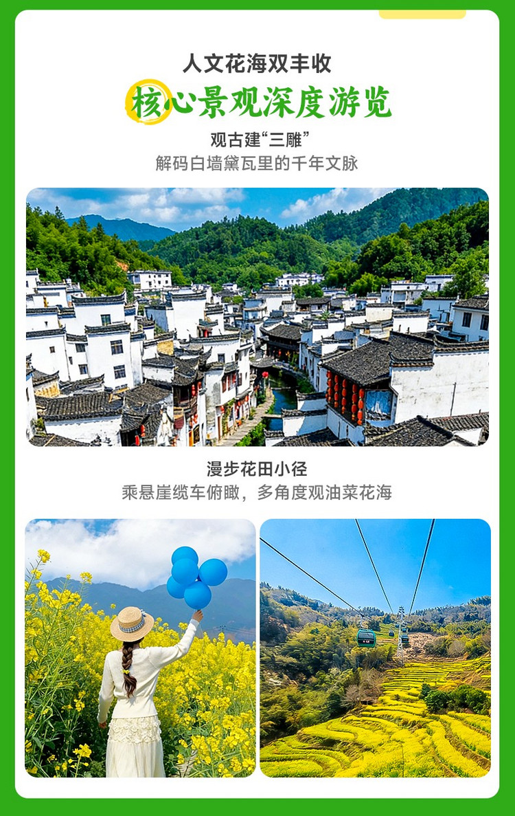 ·【篁岭】这里被称为游“赏花圣地”、“全球十大最美梯田”、“世界级古村样板”、“美术、摄影及影视创作基地”。乘坐缆车上山游览,篁岭属典型山居村落,民居围绕水口呈扇形梯状错落排布。“天街”似玉带将精典古建串接,徽式商铺林立,前店后坊,一幅流动的缩写版“清明上河图”。 周边千亩梯田簇拥,四季花海展示惊艳的“大地艺术”。 参天古树浓荫匝地,错落点缀在层叠的梯田、蜿蜒的青石板古道和曲折的清溪之间。三角梅、玫瑰等花海景观变幻,穿行在隐约可见的廊桥亭阁和粉墙黛瓦的民居村落中,远离都市喧嚣。