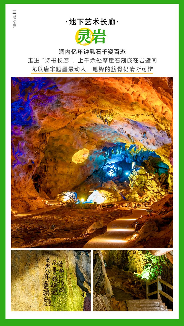 ·【灵岩】是婺源北线的地质奇观 + 人文宝库,可追溯至三亿年前的古生代,当时为浅海环境,海洋生物骨骼沉积形成石灰岩层,经亿万年流水侵蚀造就喀斯特溶洞群由36 个溶洞组成的喀斯特洞群,以 “洞险石怪水奇墨香” 著称,被誉为 “华夏第一洞天”。这里既有亿年地质雕琢的钟乳石奇观,自唐至清,留下2000 余处摩崖石刻,名将岳飞、理学大家朱熹、北宋名臣宗泽等均在此题字,集文化、书法、石刻艺术于一体,更有地下河泛舟的独特体验,是婺源少有的 “山水洞” 三位一体的自然人文综合体。