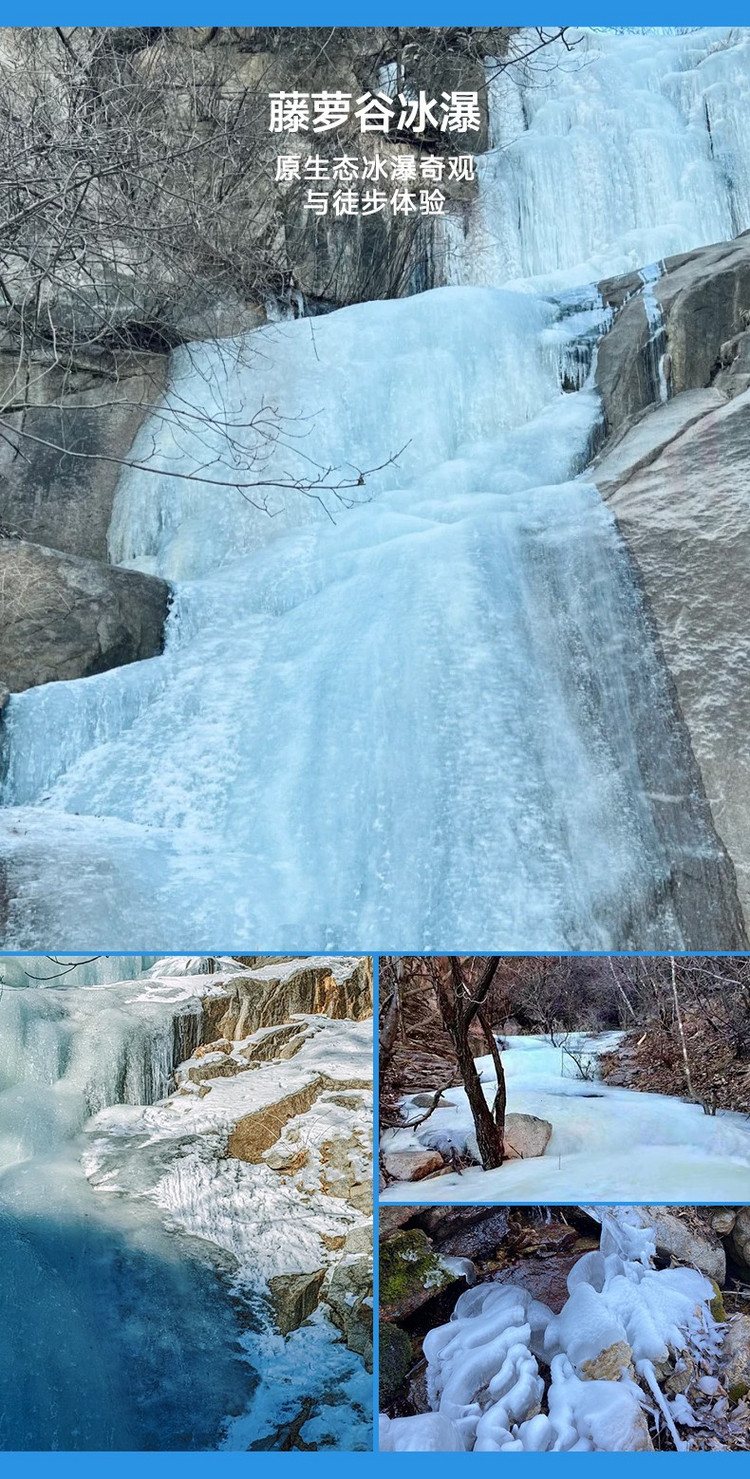 09:30左右到达徒步起点,在领队带领下徒步穿越,山林中穿行,欣赏冰瀑。藤萝谷本身因山谷内藤萝密布而得名,冬季时溪流凝结成冰,形成高低错落的冰瀑,晶莹剔透,高约几米至十几米不等,呈现出雪白中透着淡蓝色的自然奇观。藤萝谷是怀柔九谷口内的九谷之一,保留有最原始的风貌,自然景观保存最完好,原始次森林,藤萝,冰河冰瀑和日照满金谷是这个山谷最著名的奇观,因为它几乎未被开发,无人工元素,纯原始景观,冬有雄伟壮观的冰瀑,多级阶梯式的冰河,自天垂落,悬挂在峭壁之上,冰层深厚,晶莹如玉。
