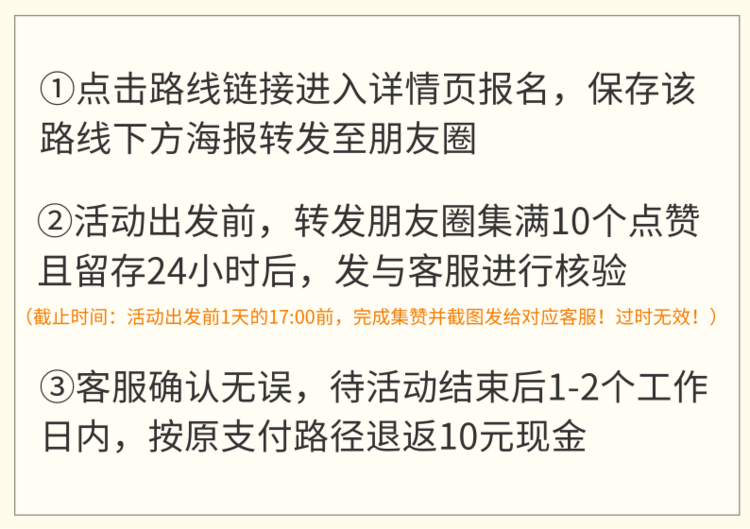活动出发前1天中午12点之前可全额退款,前一天12点之后扣除50%活动费用,前一天20点之后退出将不退还活动费用,望能理解!如活动未成团,系统自动退款到支付账户;