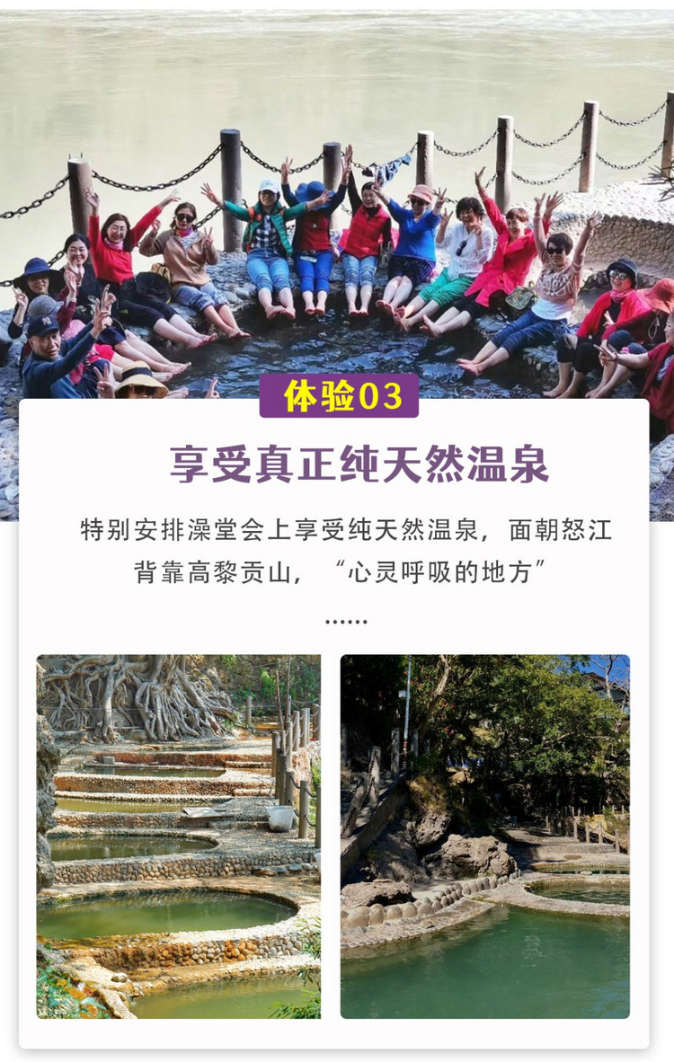 ②特别安排澡堂会上享受真正纯天然温泉,面朝怒江,背靠高黎贡山,“心灵呼吸的地方”;