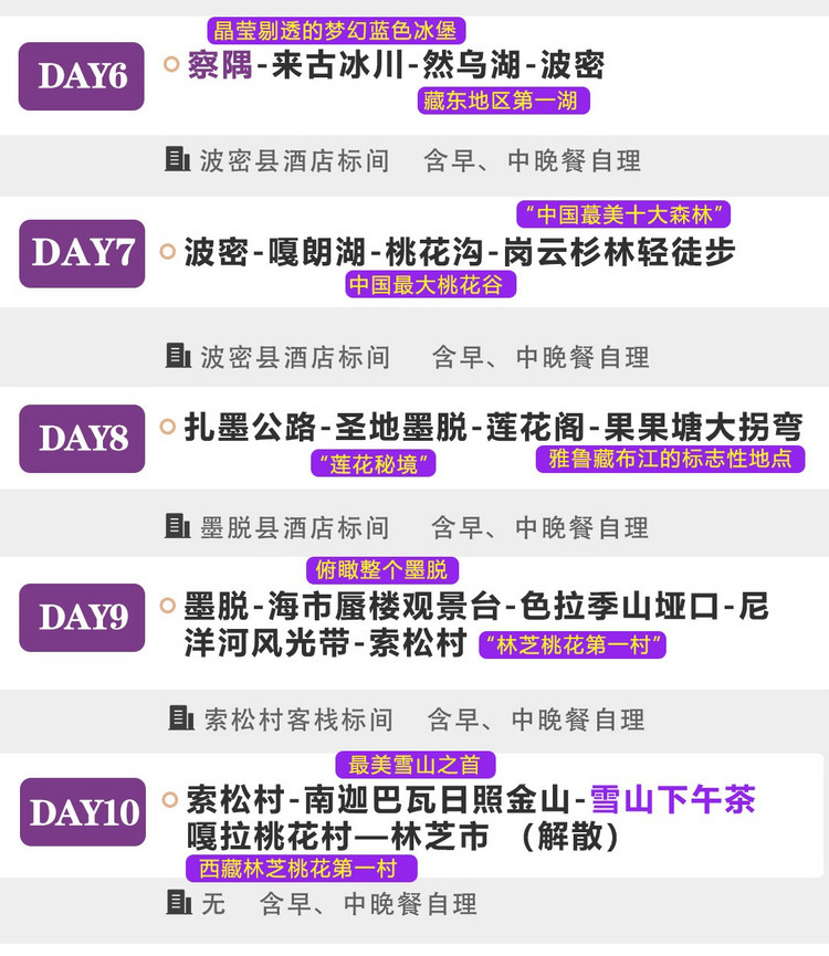 温馨提示:墨脱为双号进单号出,我们会根据到达波密的日期,灵活调整进入墨脱的时间和先后游玩顺序,请您知悉。