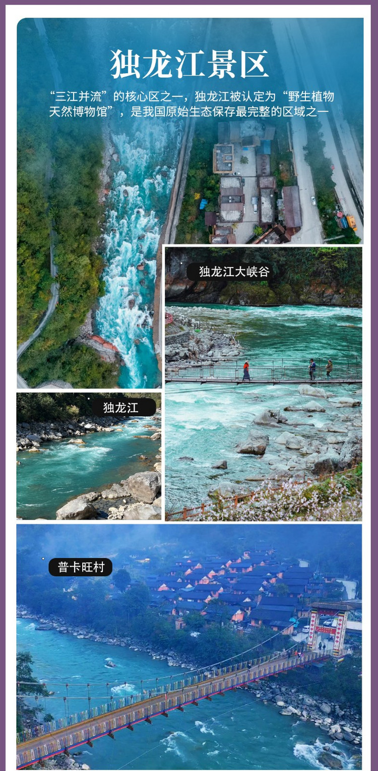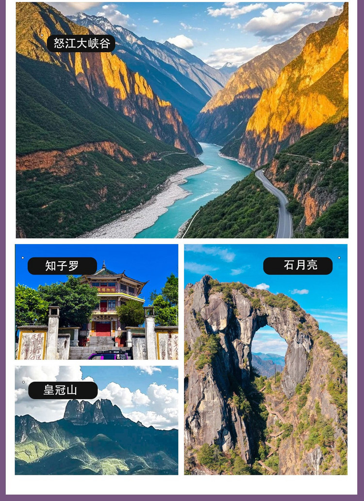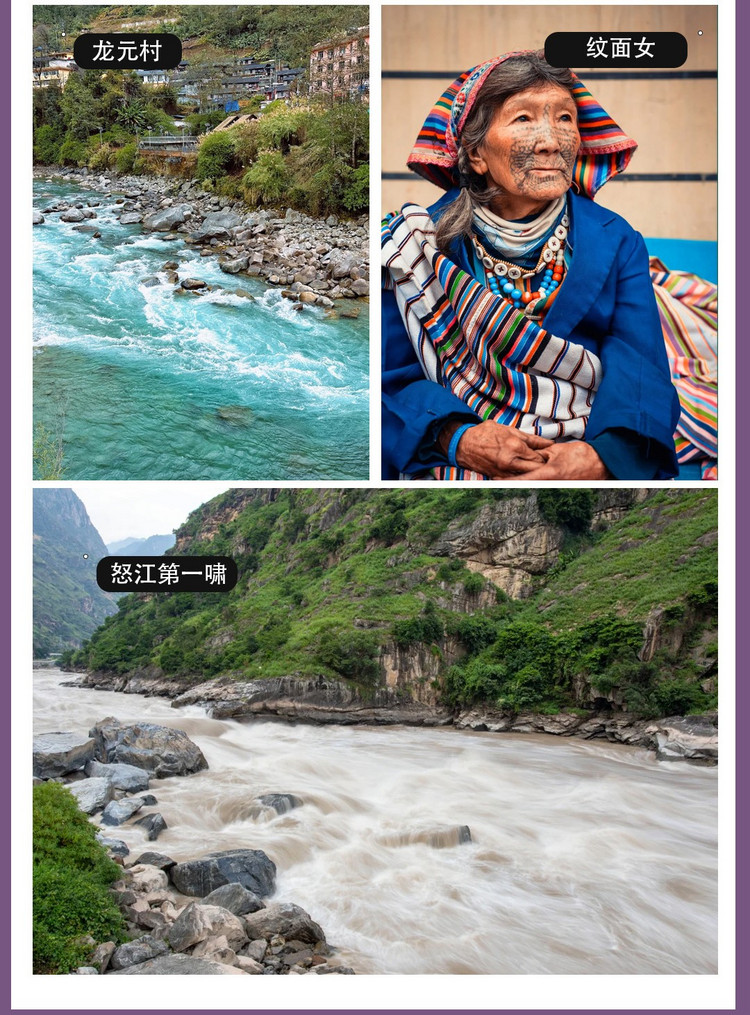 游览重点:怒江大峡谷、老姆登晨景、皇冠山、知子罗、石月亮、普卡旺村、龙元村、纹面女