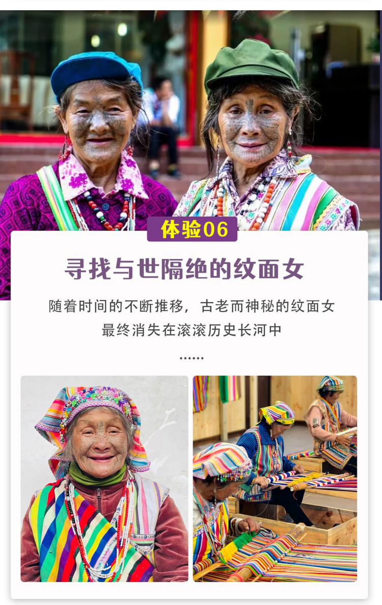 2、据了解,现在的独龙族纹面女只有不到30人在世,其中年龄最大的超过100岁,最年轻的纹面女也有60多岁。随着时间的不断推移,古老而神秘的纹面女最终消失在滚滚历史长河中。但因生命有限,我们无法人为控制,如能相见是幸运,如不能,请平常心对待。纹面女年龄都较大,合影时不接受动作指导。