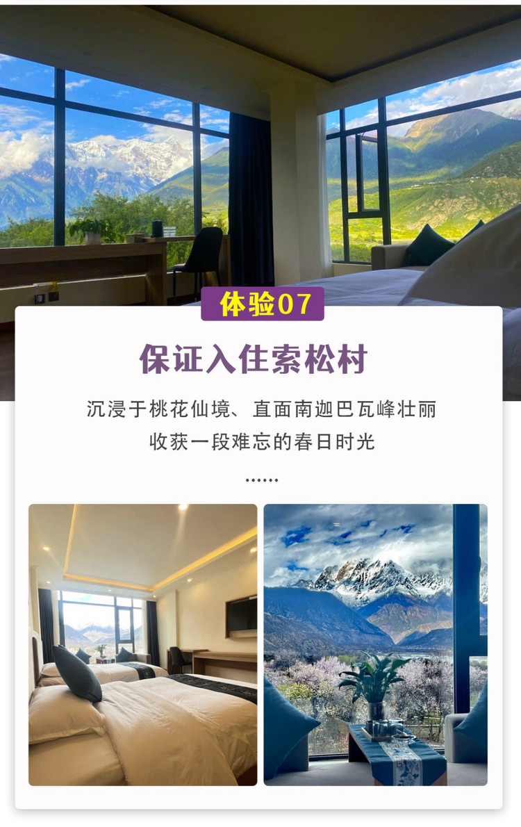 早起守候雅鲁藏布大峡谷晨曦,天气晴好可以拍到难得一见的【南迦巴瓦峰日照金山】。索松村是此行程令人震撼的地方,村子里野生桃花盛开,雅鲁藏布江汹涌而过,河谷里绿意葱荣,景色之壮观令人叹为观止。村后的观景台可俯瞰整个村子,观看不同角度的大峡谷。也可以站在桃树和村子旁,不同角度欣赏和拍摄这里的美在这里,我们还特别安排了雅鲁藏布大峡谷景区【雪山下午茶】(由于前一天到的较晚,特安排在上午进行体验),坐在桃林畔一边品茶、一边眺望南迦巴瓦峰,超级出片。