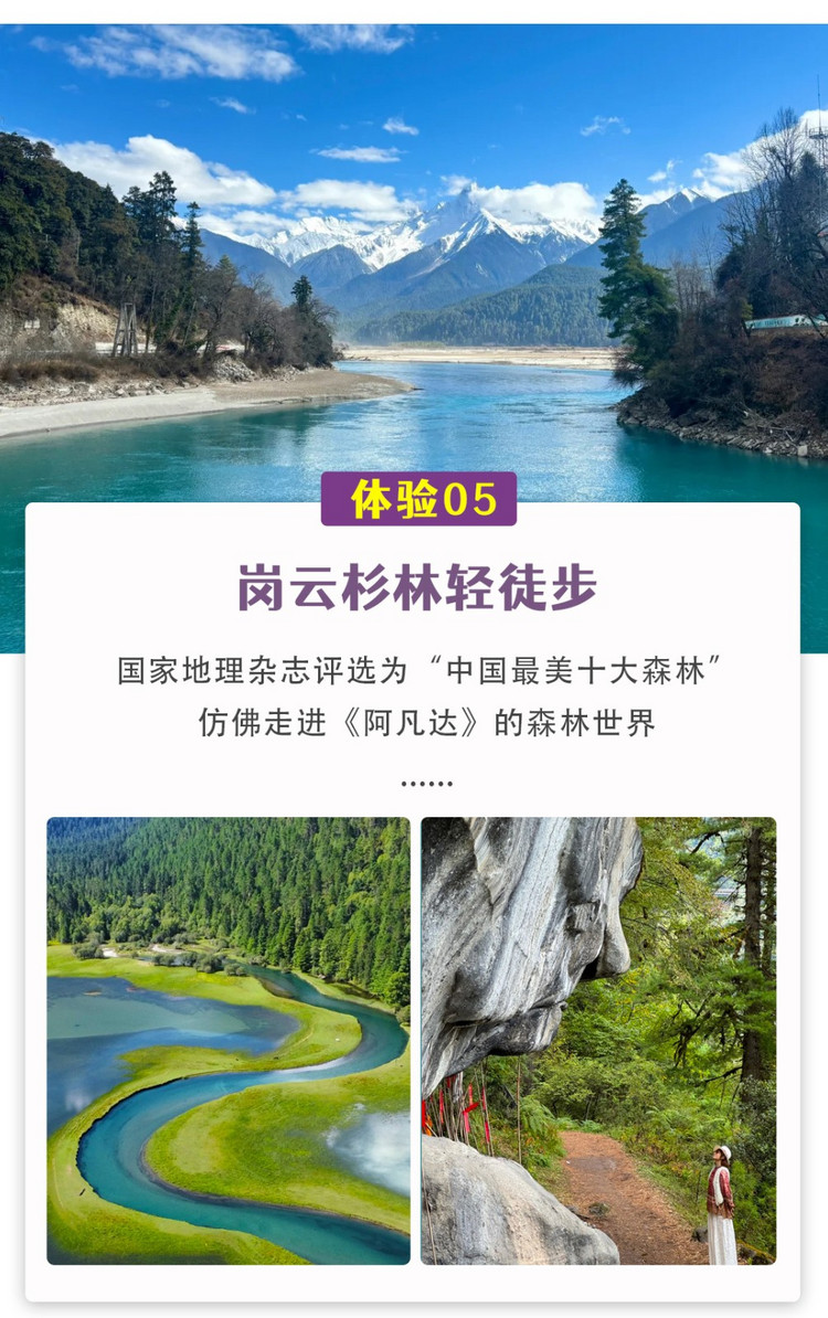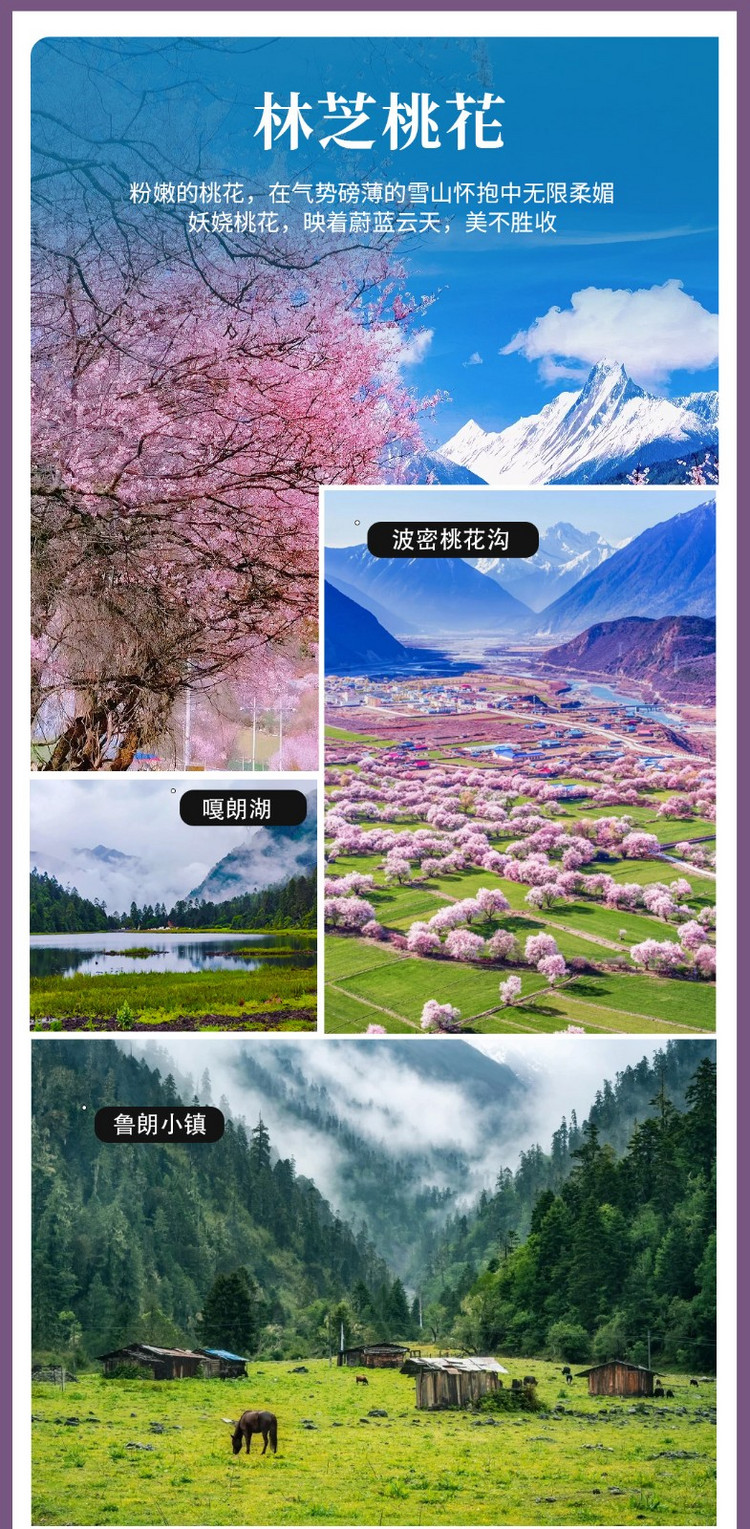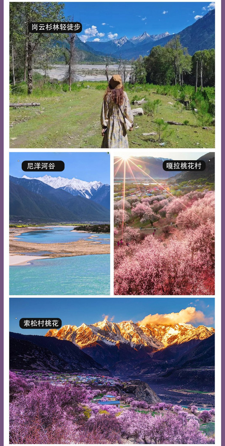 浏览重点:桃花沟、嘎朗湖、鲁朗小镇、岗云杉林轻徒步