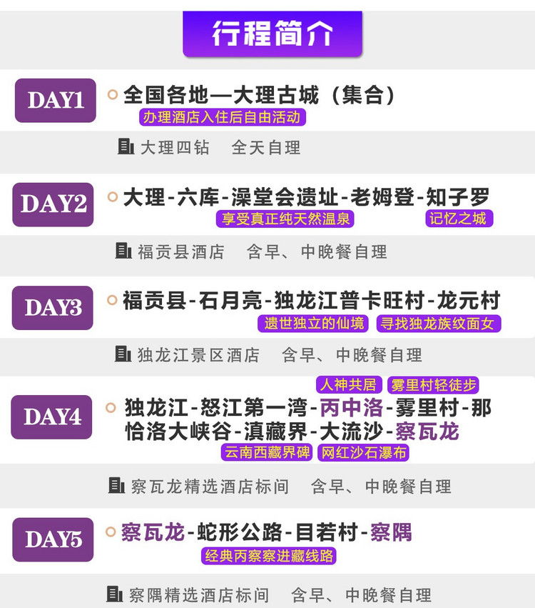 2.【住宿】:全程9晚舒适型住宿:1晚4钻酒店(大理)+3晚核心景区住宿(独龙江+墨脱县+索松村)+5晚精选酒店(察瓦龙乡+察隅+波密2晚+福贡1晚)