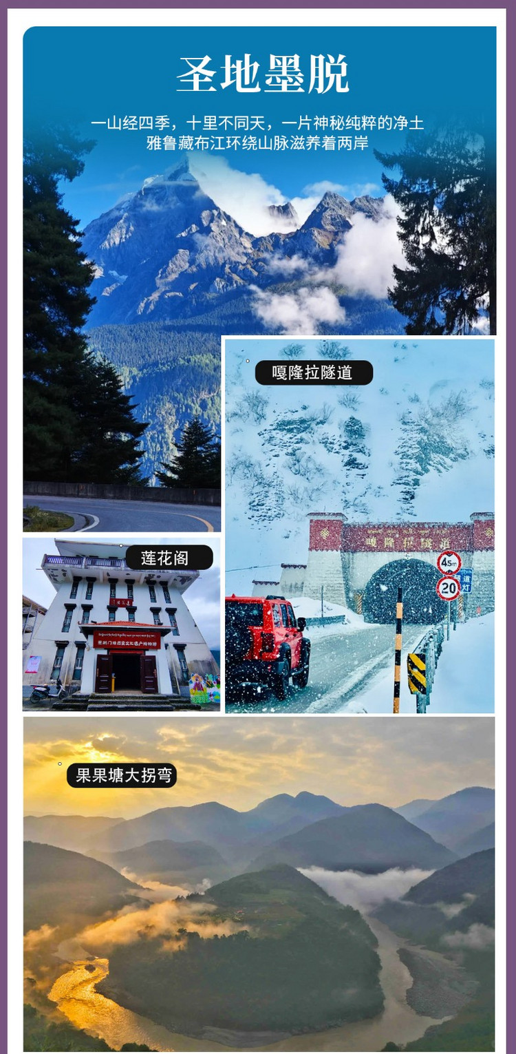 自波密县城出发,前往【圣地墨脱】。这里是中国最后一个通公路的地方,并且进入需要提前办理边防证。这是世界海拔最高的绿洲,雪山冰川、林海险道、清溪飞瀑一路相伴,从海拔4300米的【嘎隆拉隧道口】直降至【墨脱县城】的海拔1000米,从高寒不毛到针叶林再到热带雨林,从壮观原始的冰川峡谷到清新扑面的蕉林稻田……这分明就是一幅垂直分明的四季画卷挂在你眼前!这便是中国西藏东南部奇特的地理单元—“莲花秘境”墨脱。