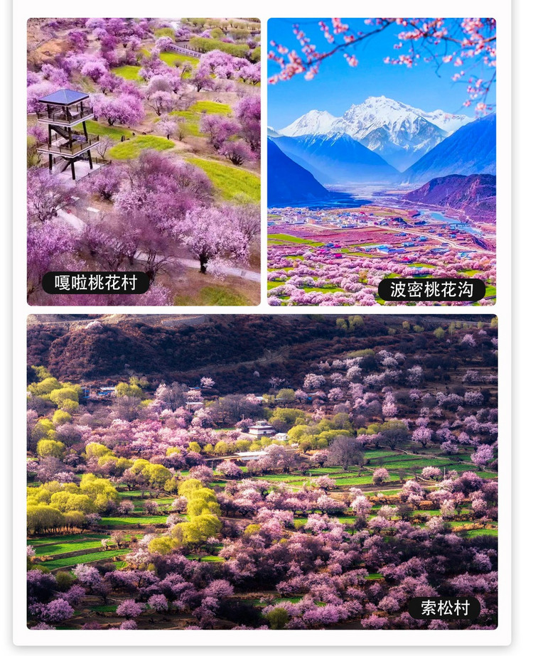 随时前往林芝【嘎拉桃花村】,林芝的【嘎拉村】漫山遍野的桃花开始铺满山坡,绵延至河谷。大株的桃花树如同桃花仙子,簇立在尼洋河畔,雪山之下,与云朵相拥,美到令人窒息。游玩结束后送到林芝结束行程,先送【林芝火车站】,然后再到林芝市区解散。
