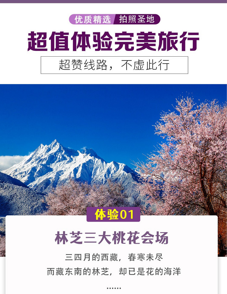 【美景合集】:线路风景优美,元素丰富。可欣赏到神山圣湖、冰川峡谷、雪山垭口、藏区名寺、花的海洋等!在最美时节,一路穿越最美公路,到达醉美藏南,欣赏国内最美桃花!