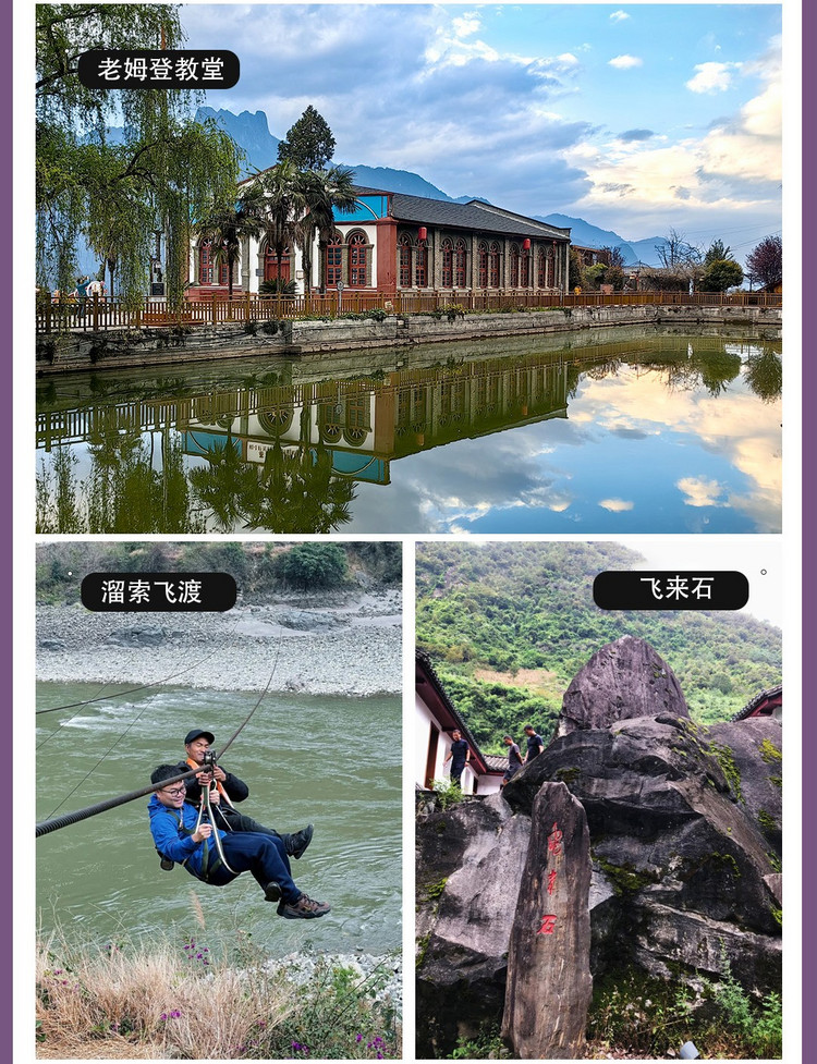 在前往老姆登的途中,我们还会经过两岸峰峦壁立,江中怪石林立,江水咆哮如雷的【老虎跳峡谷】、奇峰出奇石,险情出险缘的【飞来石】。最后进入【老姆登】,一边是碧罗雪山,一边是高黎贡山,中间还有 怒江 奔腾而过。在云朵变幻之际,天空露出一块一片的亮蓝。适时集合前往参观【老姆登教堂】,教堂高耸的十字架和白墙、红瓦、红窗倒影在碧绿的水塘中,连绵巍峨的高黎贡山是它的背景,静谧而神圣。这里是洗去浮躁,放松心情的好地方。