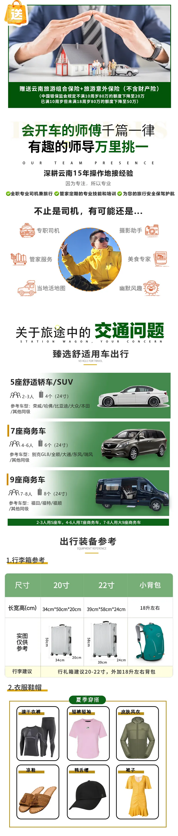 1、交通:行程中车辆使用费、油、路桥费、司机住宿费用,根据人数安排车型;