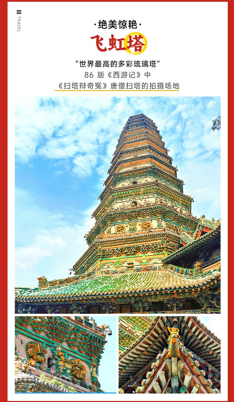 ·【飞虹塔】始建于东汉,其前身是阿育王塔,即佛祖舍利塔。世界吉尼斯纪录认证“世界最高的多彩琉璃塔”。整座塔身多采用黄、绿、蓝三彩琉璃,出檐处有斗拱、佛像、菩萨、金刚、花卉、盘龙等各种构建和图案,整座塔流光溢彩,华丽非凡,阳光下状若飞虹,故名飞虹塔。它还是 1986 版《西游记》十八集 “扫塔辨奇冤” 中祭赛国金光塔的取景地