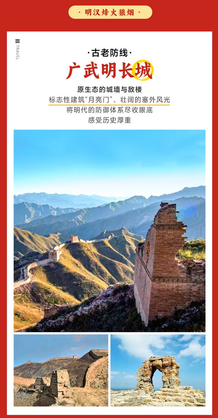 广武明长城与广武汉墓群,一个是雄伟的军事防线,一个是肃穆的将士陵园,它们共同见证了古代北方游牧民族与汉民族之间的冲突与融合。来到这里,你不仅能欣赏到壮丽的风景,更能触摸到历史的脉搏,收获一段难忘的历史文化之旅。