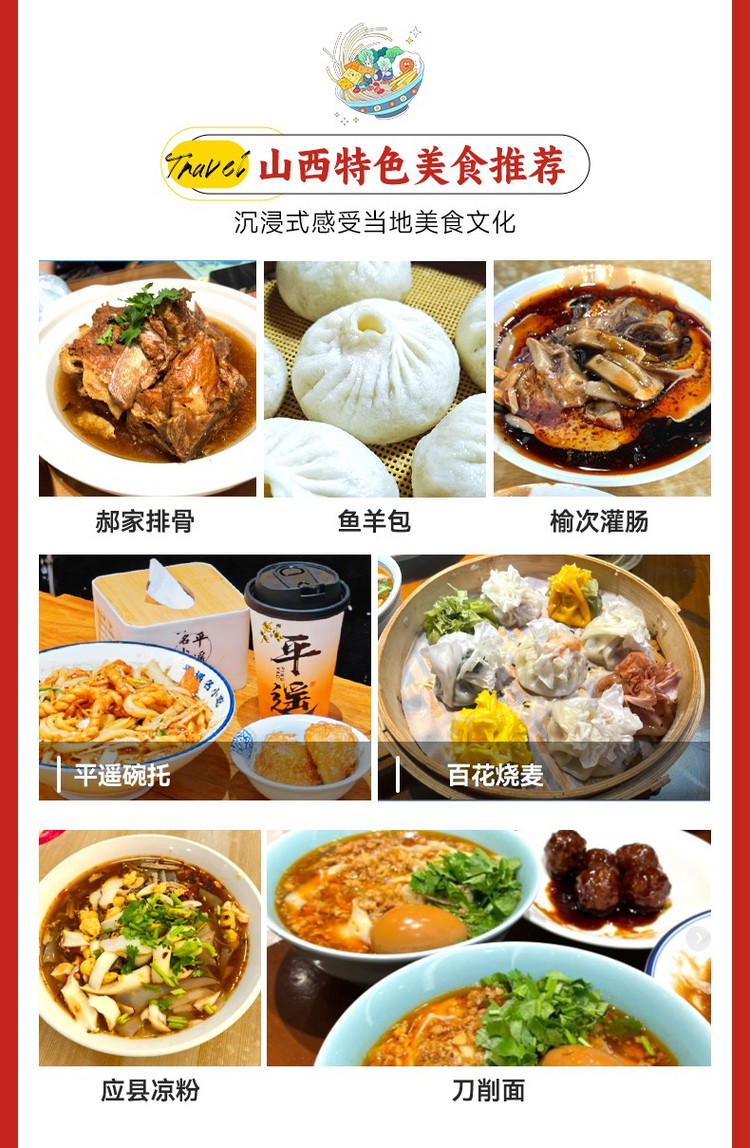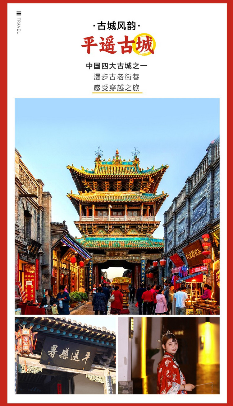 ·【平遥古城】这里是个放松心情的地方,体验平遥的古香古色吧!尽情品尝平遥内的美食:刀削面、猫耳朵、山棘果汁...让你体验山西舌尖上的味道! 可以登上古市楼看古城全景,亲手抚摸岁月拂过的痕迹,在静默中瞻仰其雄伟风姿。穿梭于古城的大街小巷,寻找你心中的平遥,了解古城的文化,了解平遥的历史。
