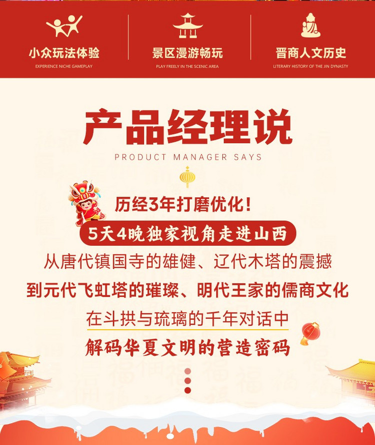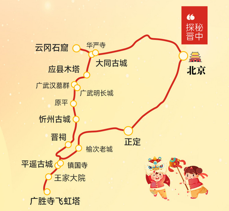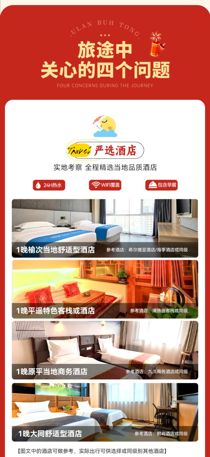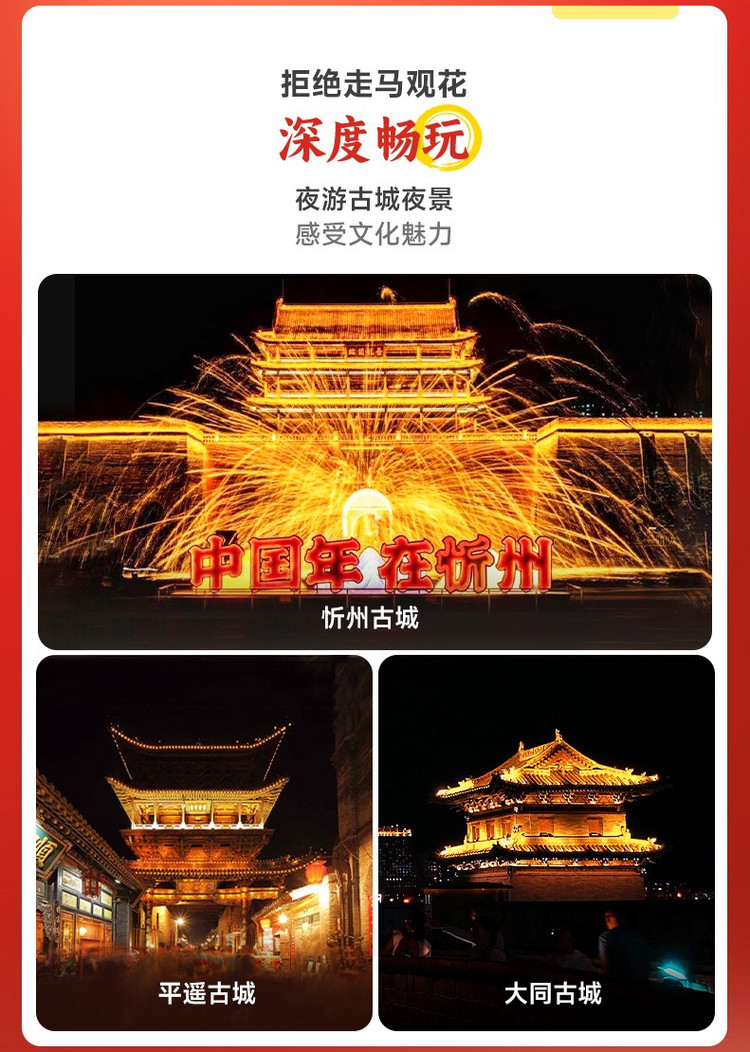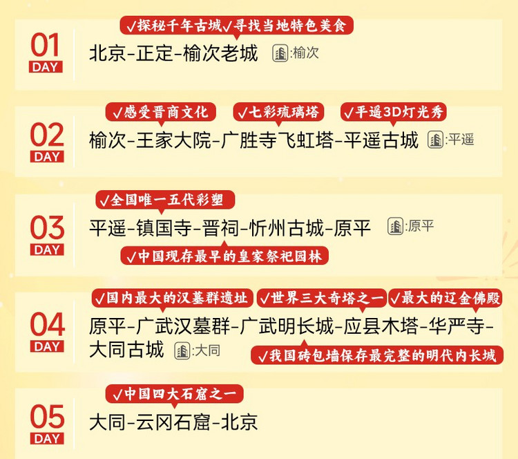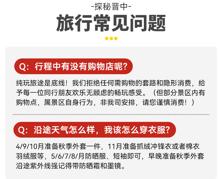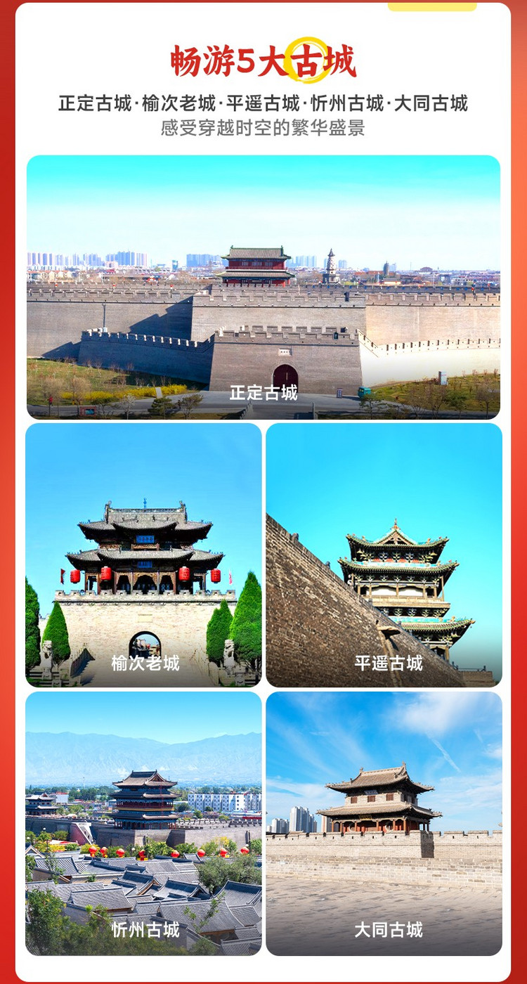 王家大院旺季55/淡季35、广胜寺飞虹塔70、镇国寺23、晋祠博物馆80元、应县木塔50元、云冈石窟120元,行程内其他景区暂时未收取门票费,如临时产生多余门票费用自理,节假日门票请提前在各景区公众号实名制预约!