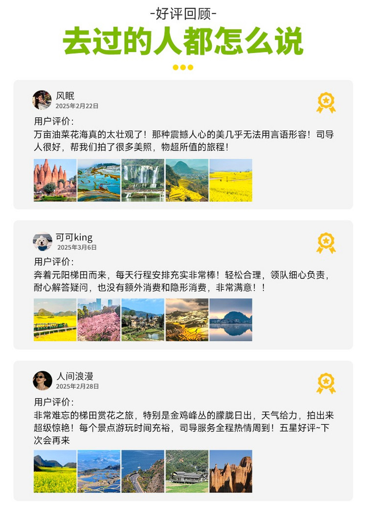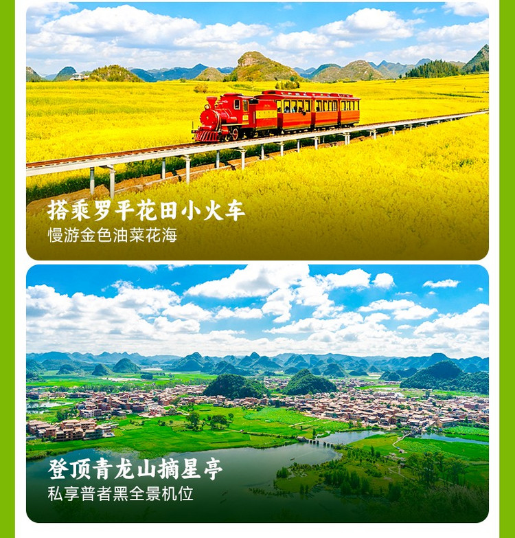 13:00 抵达【罗平油菜花主会场】。罗平有两项“油菜花之最”,一是有国内最早的油菜花季,一般从每年二月初开始,持续到三月底四月初,是年初赏花的著名油菜花旅游目的地。二是罗平是吉尼斯世界纪录认证的“世界最大的自然天成花园”,这个花园最多的花自然是油菜花,光是连成片的油菜花就达二十万亩,被称为油菜花海也不为过。我们在这里为大家赠送【花田小火车】体验,在油菜花海留下一次难忘的回忆。