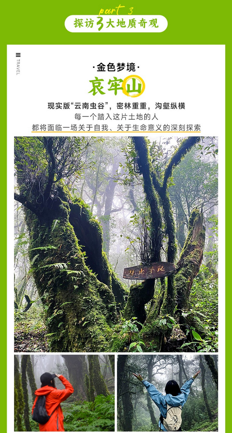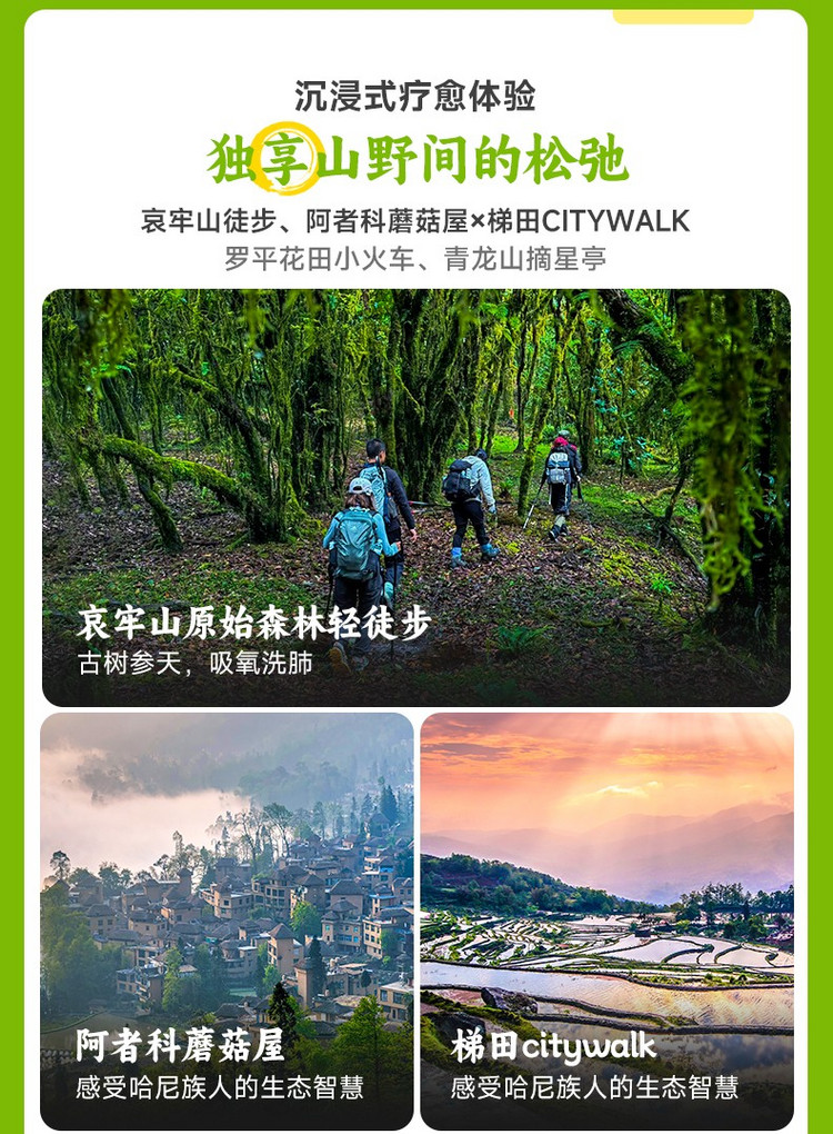 2. 哀牢山轻徒步体验时,务必在景区道路上行进,请勿前往未开发区域,避免意外,如遇野生动物活动期,替换景区为【石门峡山林折返徒步体验】。