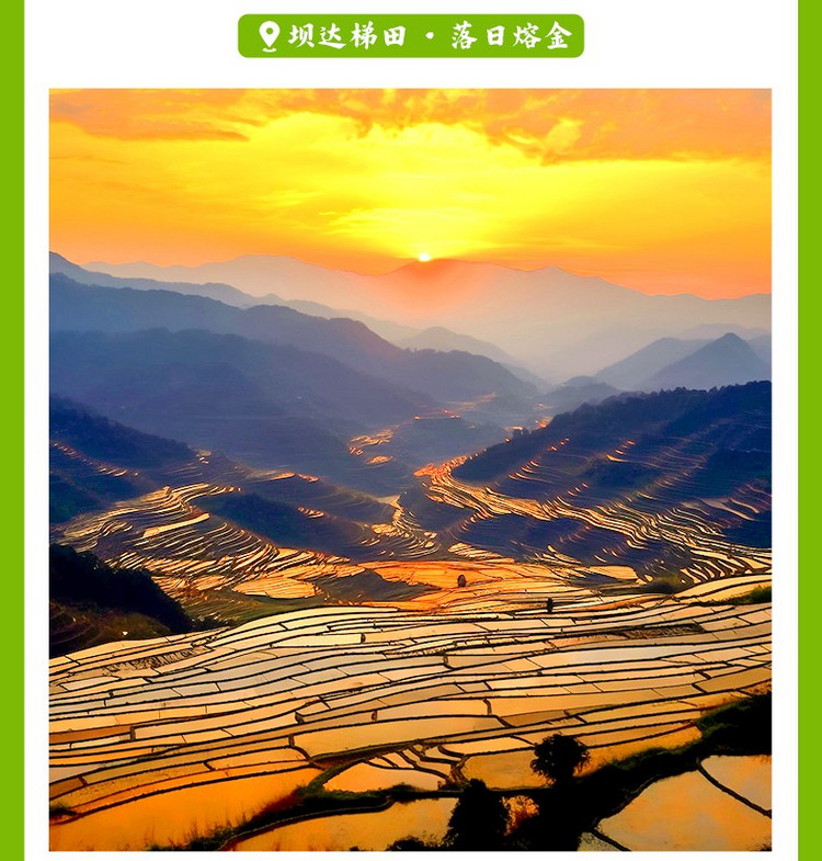 15:30抵达元阳后沿途欣赏【箐口民俗村】,【老虎嘴梯田】。随后前往等候【坝达日落】,前往等候【坝达日落】,夕阳西下满天红霞的时候,站在坝达,千年梯田就在脚下向远处延伸,镜面般的田面反射着霞光,笼上暖暖的金色,衬托出柔美的曲线,不得不感叹人与自然的鬼斧神工。