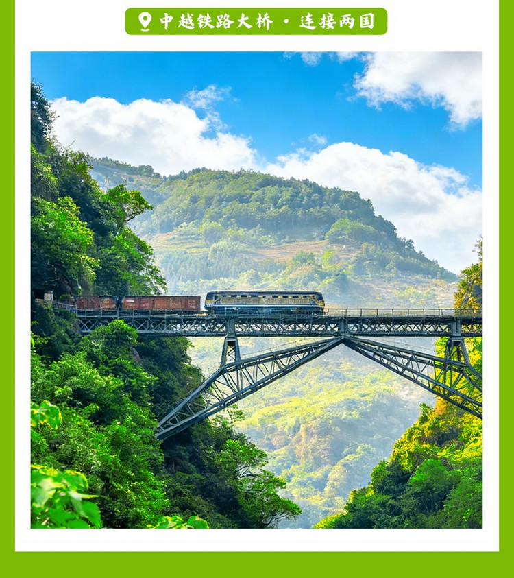 10:15 前往【103号界碑】,界碑如同沉默的卫士,矗立于此宣示着国家领土的主权。其碑身上的数字是独一无二的“身份号码”,而编号后若带括号(如“1”),则通常表示这是以河流为界时,在边界线某一侧竖立的“双立界碑”或“三立界碑”中的一块。在这里,你可以真正体验“一步之遥,两国之间”的地理实感。随后抵达的这片红河与南溪河交汇的河口,海拔仅76.4米,是云南地理的“最底端”【云南最低海拔点】。站在这里,与省内海拔6740米的最高点——卡瓦格博峰直线相距约900公里,海拔落差却超过6000米,亲身感受云南“一省之地,囊括四季”的极致立体气候。最后,目光聚焦于这座承载百年风云的钢铁动脉。【中越铁路大桥】始建于1903年,是第一条连接中国西南与海外的滇越铁路的关键节点。它历经三次被毁与重建,至今仍横跨南溪河,桥中央即是国界。凝视这座被誉为“世界工程奇迹”之一的百年米轨桥,仿佛能听见历史与现代贸易列车并行的轰鸣。