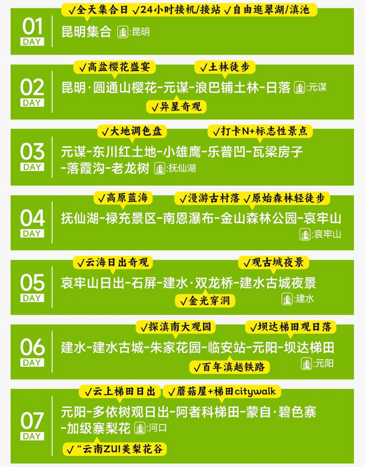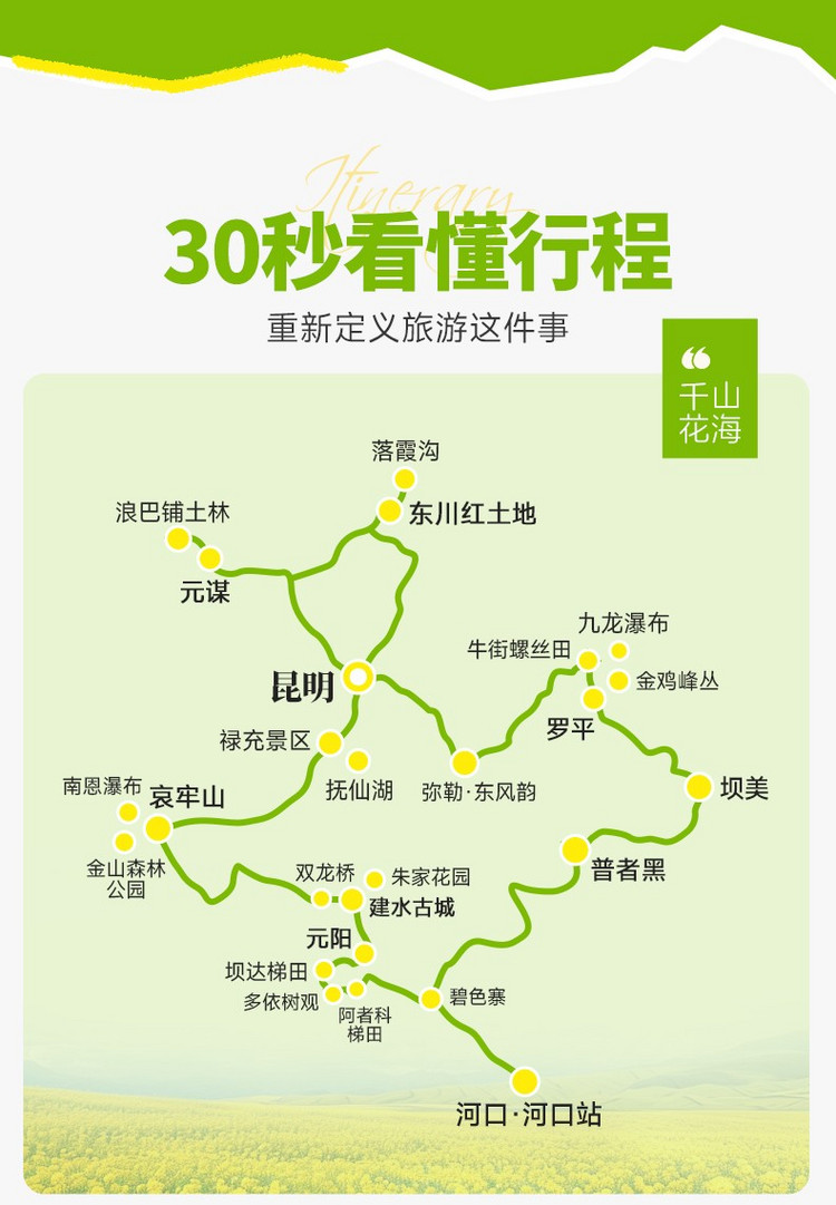 4、门票:圆通山、元谋土林,落霞沟景区, 抚仙湖碌充景区、哀牢山金山森林,朱家花园、元阳梯田、阿者科、碧色寨、加集寨,三生三世、坝美、罗平小火车、金鸡峰、九龙瀑布、东风韵