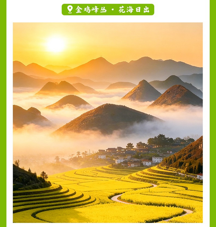 06:30 【金鸡峰从日出】是罗平峰林核心地带,这里的山连山绵绵无尽,层峦叠嶂。走进峰林,虚渺飘逸,变幻莫测。峰林美景每年都会吸引众多中外的伙伴,也成为了海内外摄影家纷至沓来的一块摄影宝地。游览结束返回酒店用早餐后出发。
