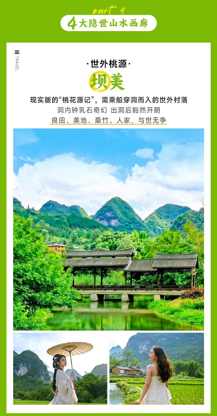 13:00 前往【坝美·世外桃源】抵达此地需完成一场仪式:乘船穿过幽暗溶洞,仿佛穿越时光隧道。洞尽天明,古榕、水车与稻田忽然浮现,壮族村落静卧群山怀中。这里是现代版桃花源记的真实注脚,守护着与世无争的农耕光阴。。