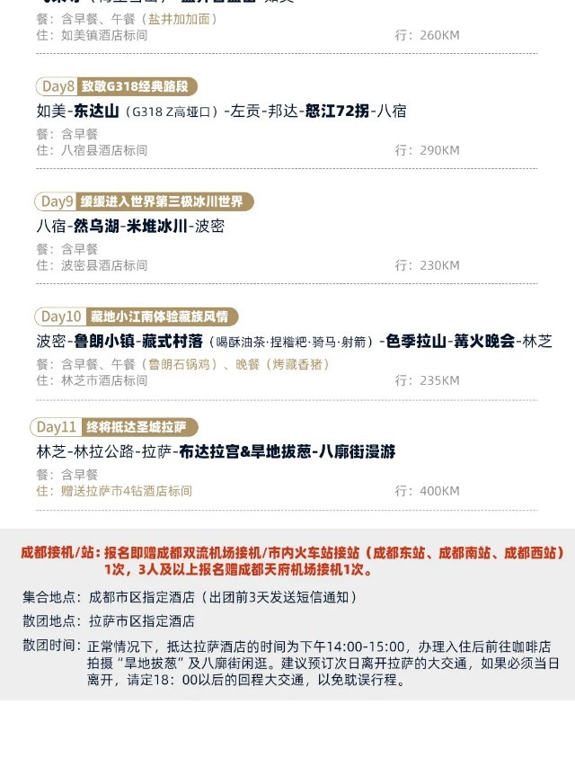 2、用餐:全程午餐(第7天:盐井加加面+第10天:鲁朗石锅鸡除外)、晚餐(第10天:烤藏香猪除外)均不含,需自理(其余早餐为赠送,不用不退),大家可以一起AA,也可以单独用餐,工作人员的用餐团费当中已包含,不需另外支付;