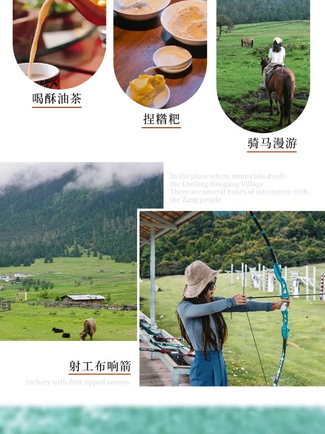 4、藏地人文体验:藏家主人献哈达+喝酥油茶+捏糌粑+骑马+射箭+挂经幡+撒隆达;
