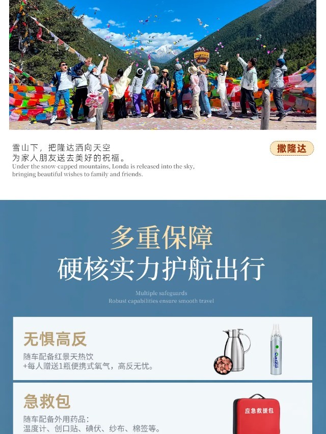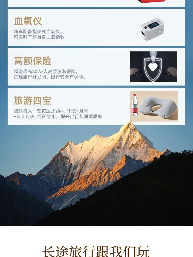 (1)今天的行程将向高海拔地区前行,当天翻越4座海拔4000米以上的高山,为避免高原反应,我社随车备有便携式氧气以备急用;